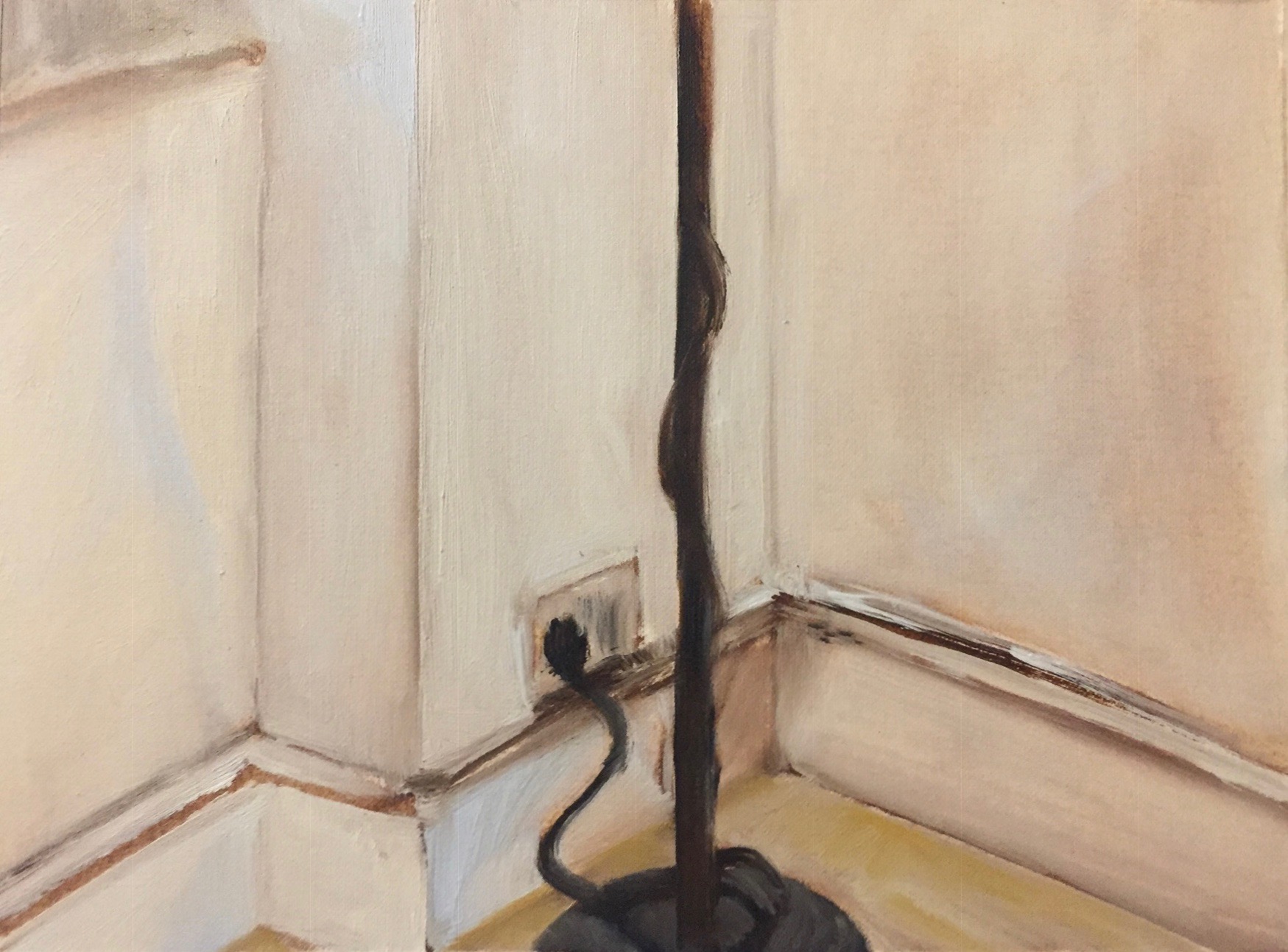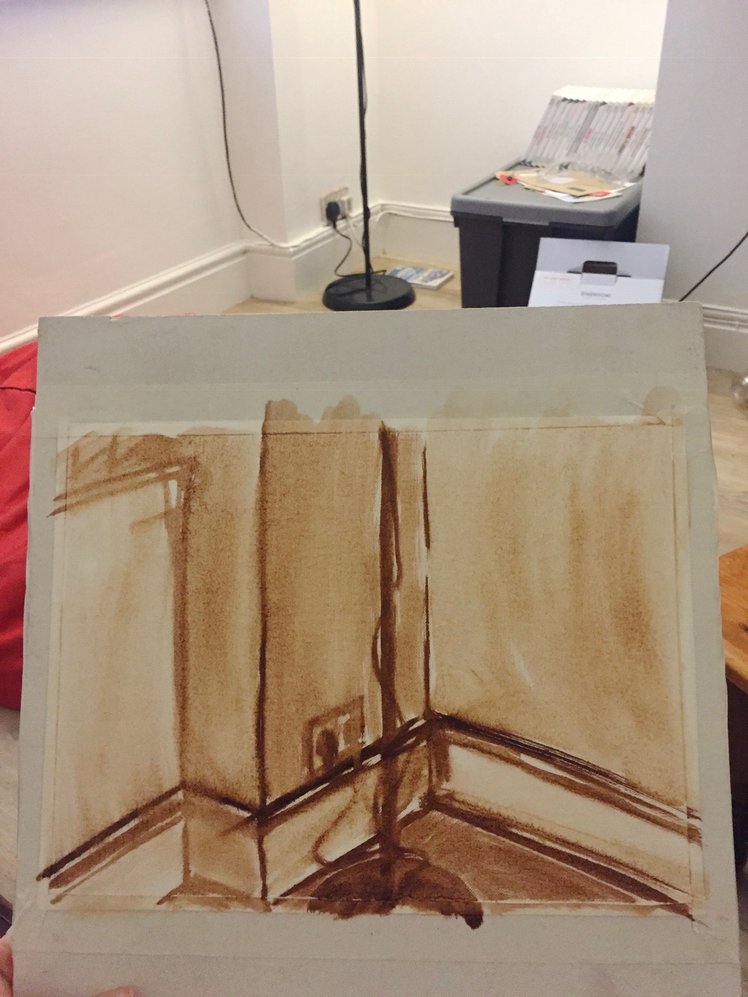 Underpainting with darker lines for edges of walls etc in thinned oil paint.