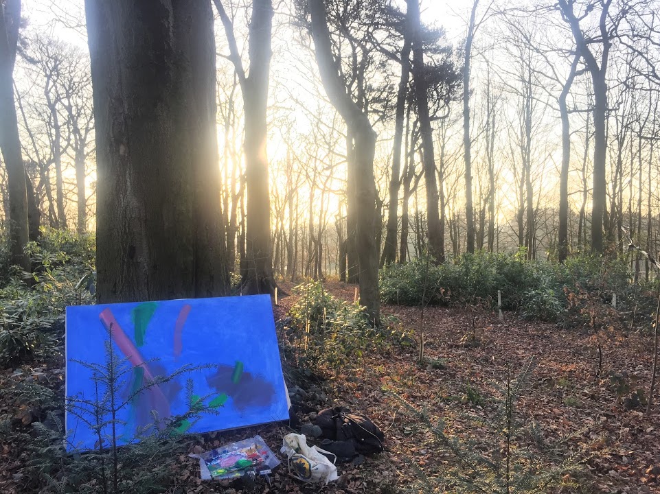 Painted outside in the woods on a still, sunny evening facing the setting sun.
