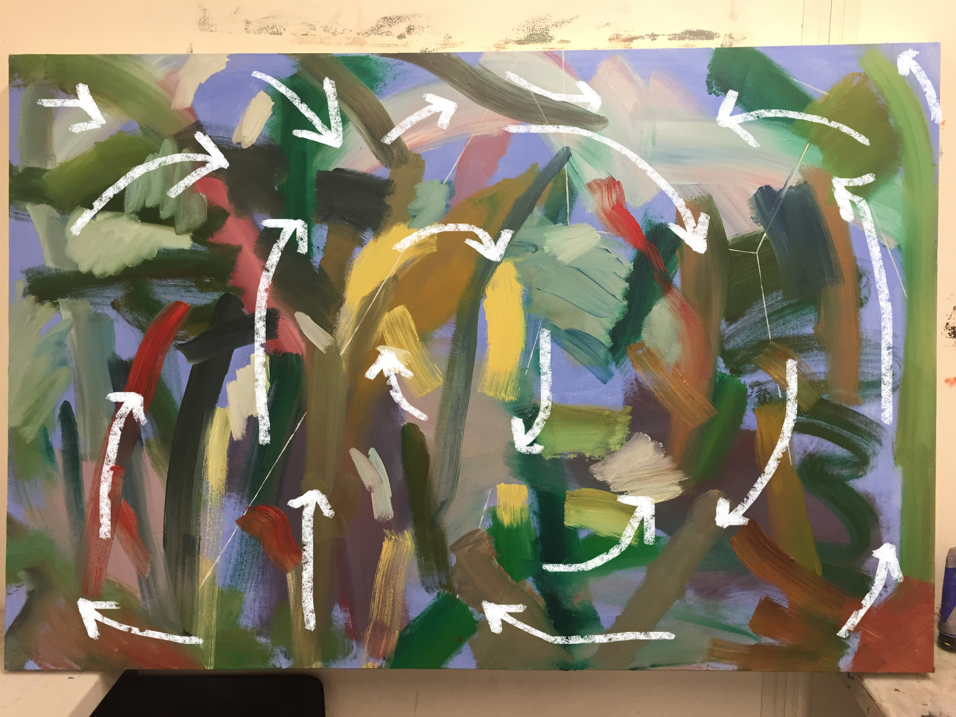 I chose the shape and position of the structure based on what I saw in the shape of the canopy when I was painting outside. I marked the rough shape into the paint, and used the memory of this shape plus photos and the marks made to draw the structure accurately.