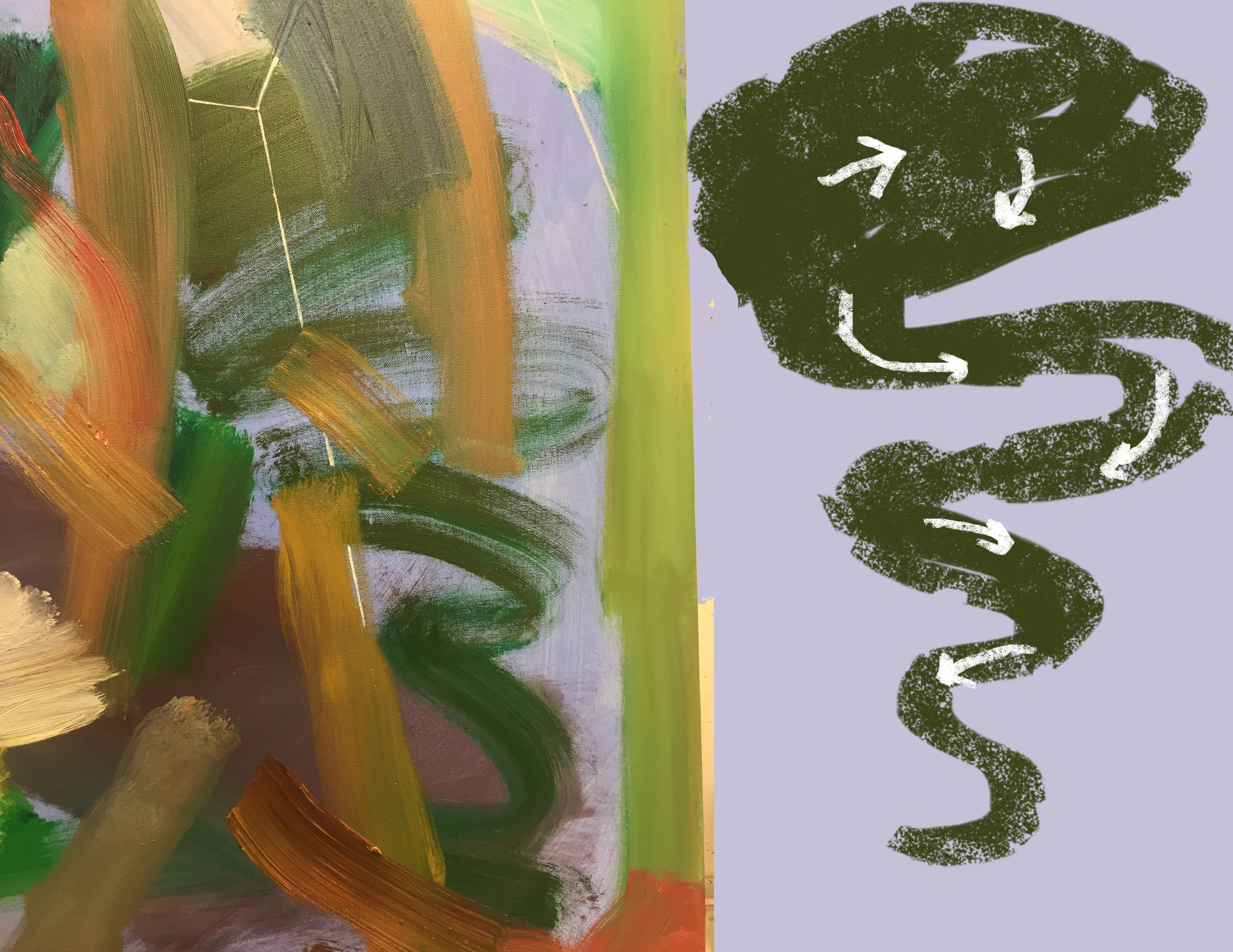 I’ve highlighted this brushstroke (right centre on canvas) with a digital sketch above. This shape I’ve used in charcoal sketches in my sketchbook but they work in paint as well.
