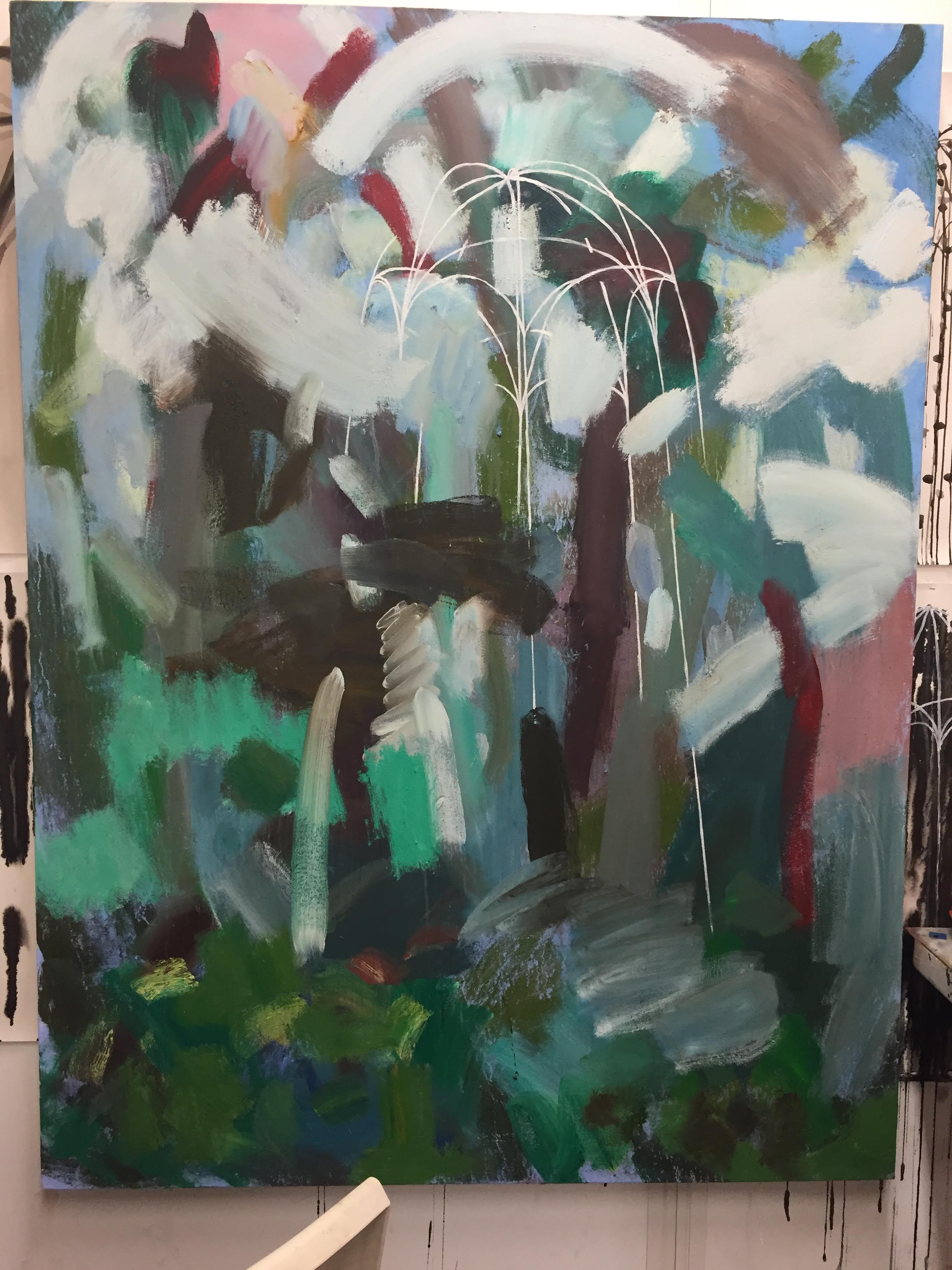 This is an image from my first sitting for adding the structure. To make the shape I used the photoshop image (last blog post), photos from the location I painted this canvas in the woods, and inspiration from the ink structures.