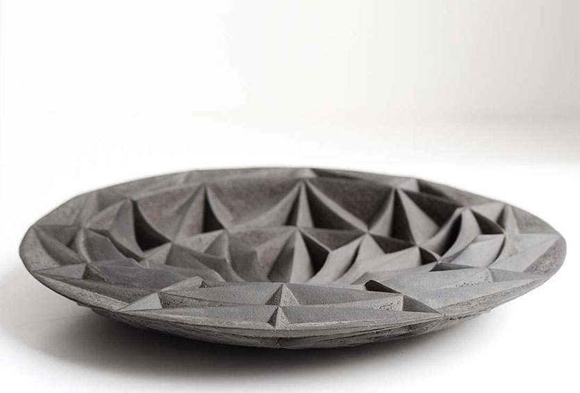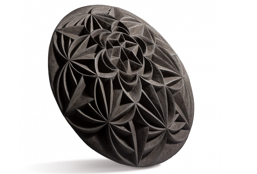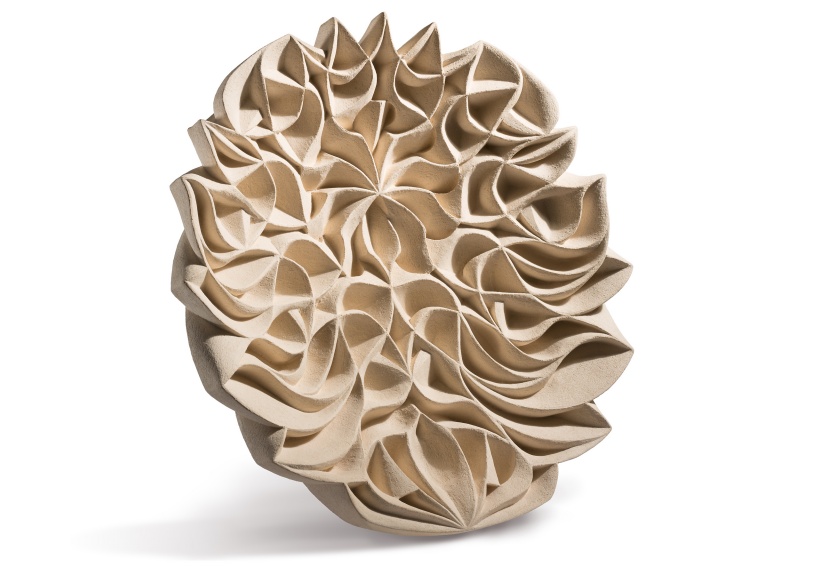 Inspired by geometry, architecture, natural forms and foreign travel, she creates deeply carved forms in unglazed ceramic, bronze, stone, wood and cast glass.