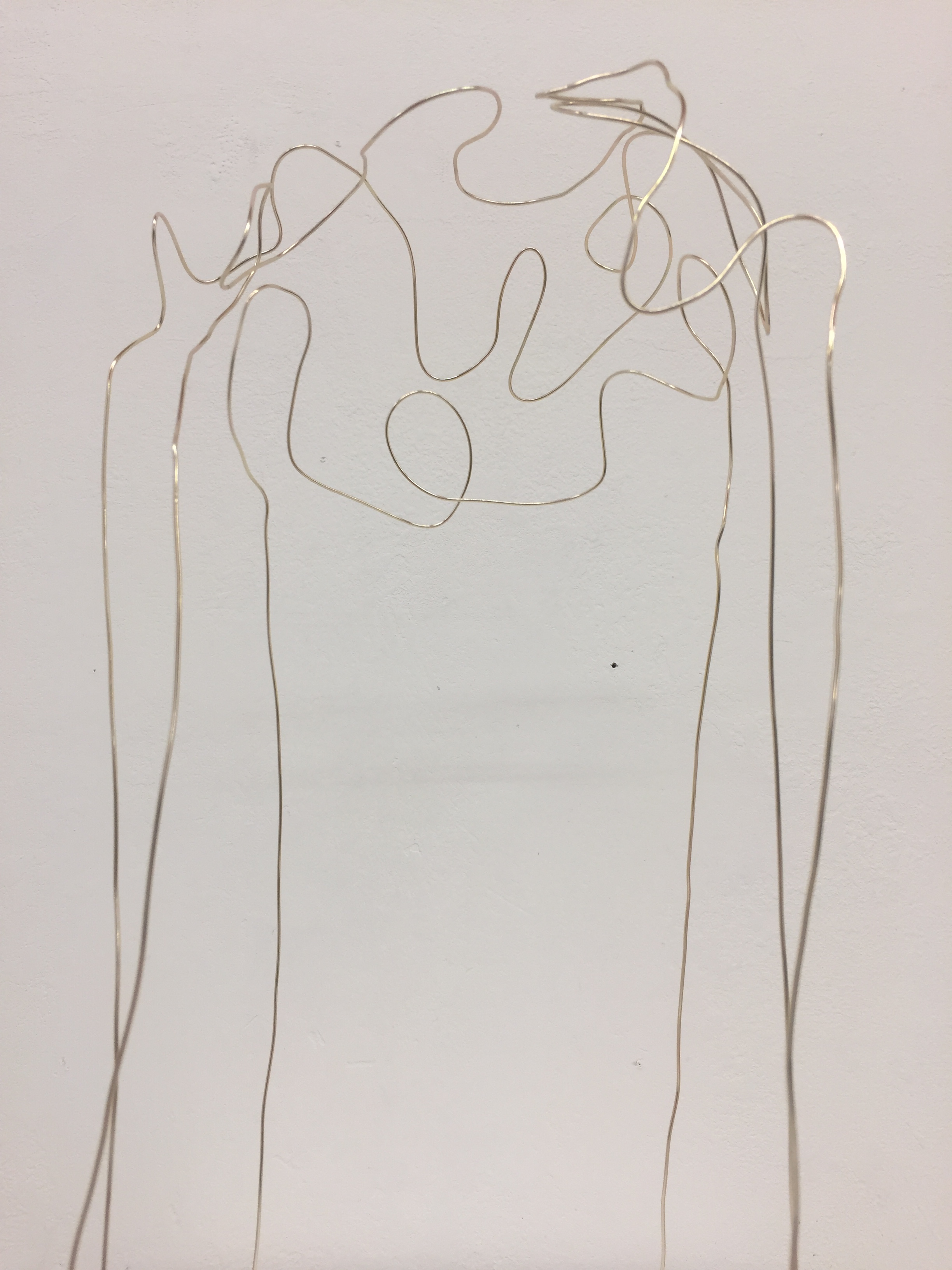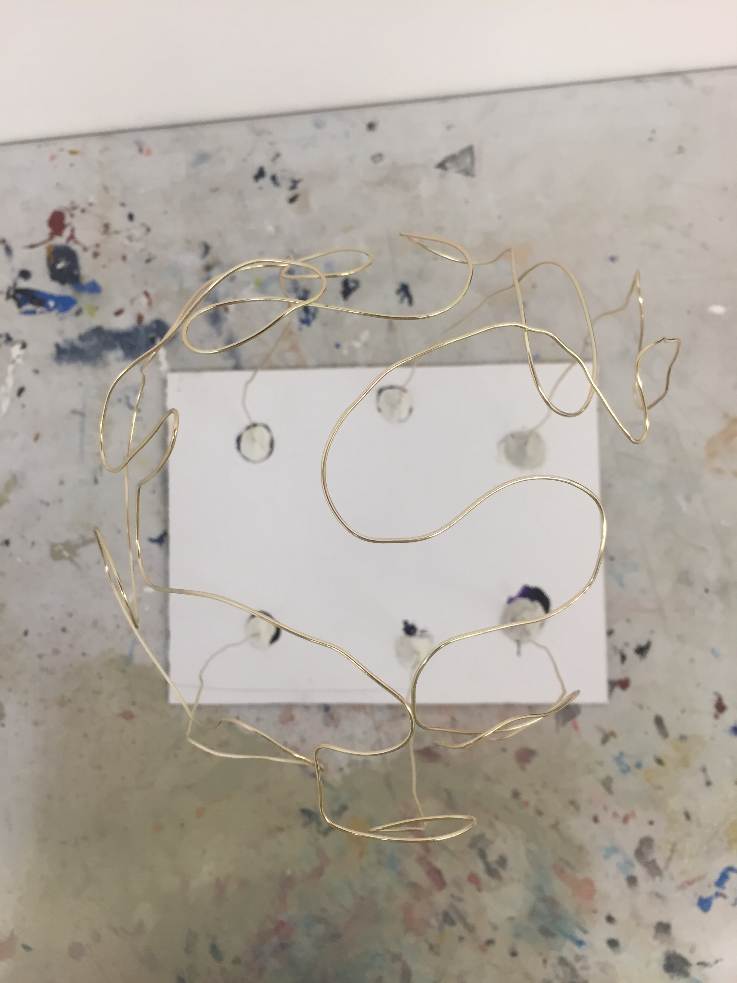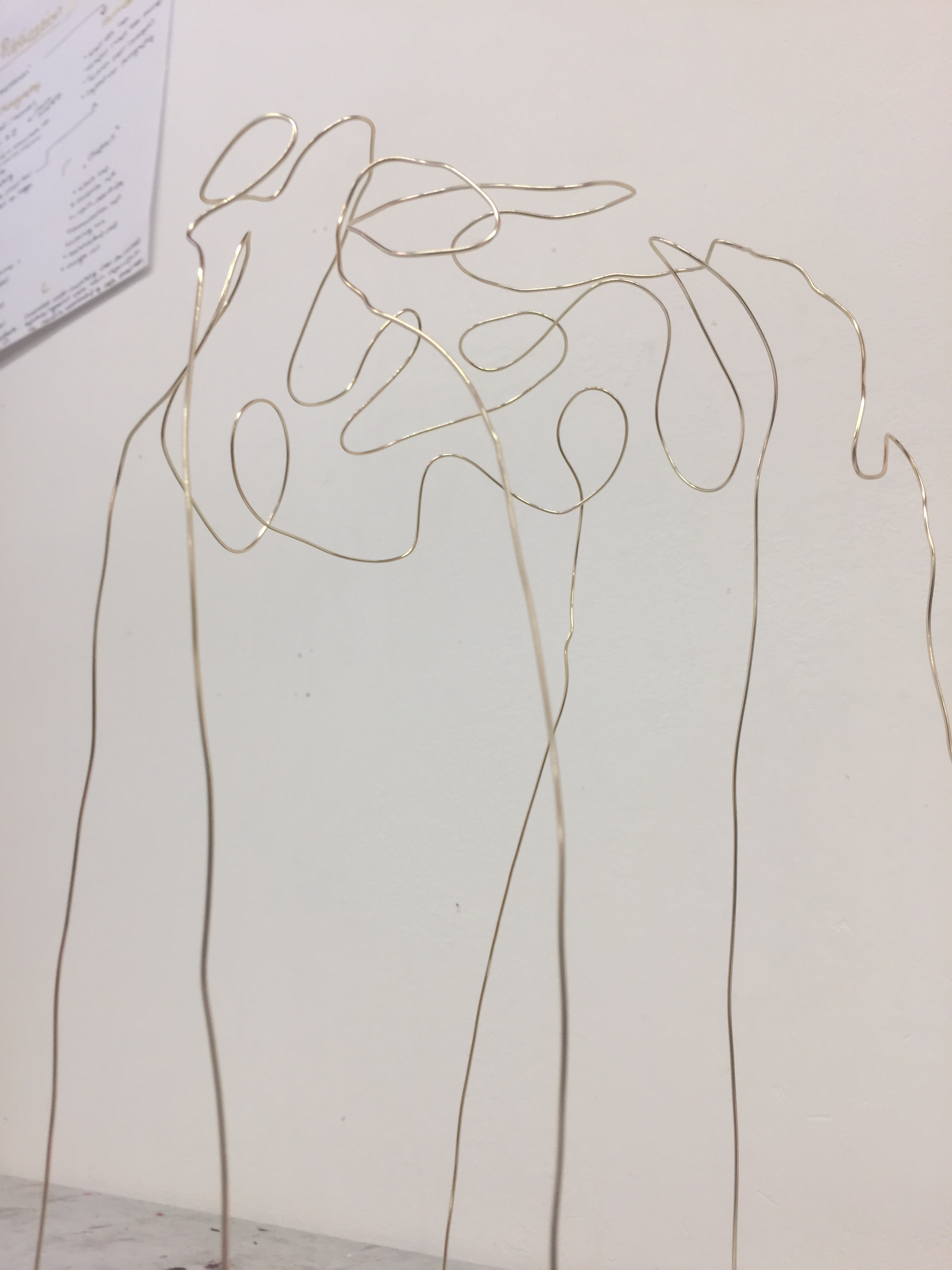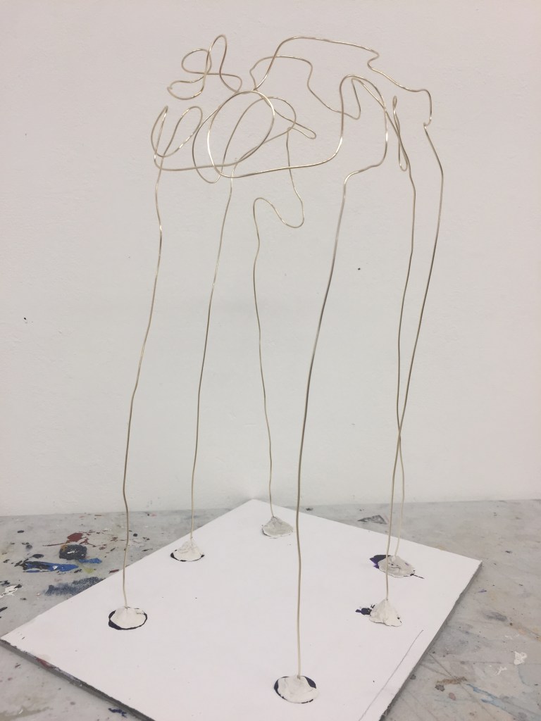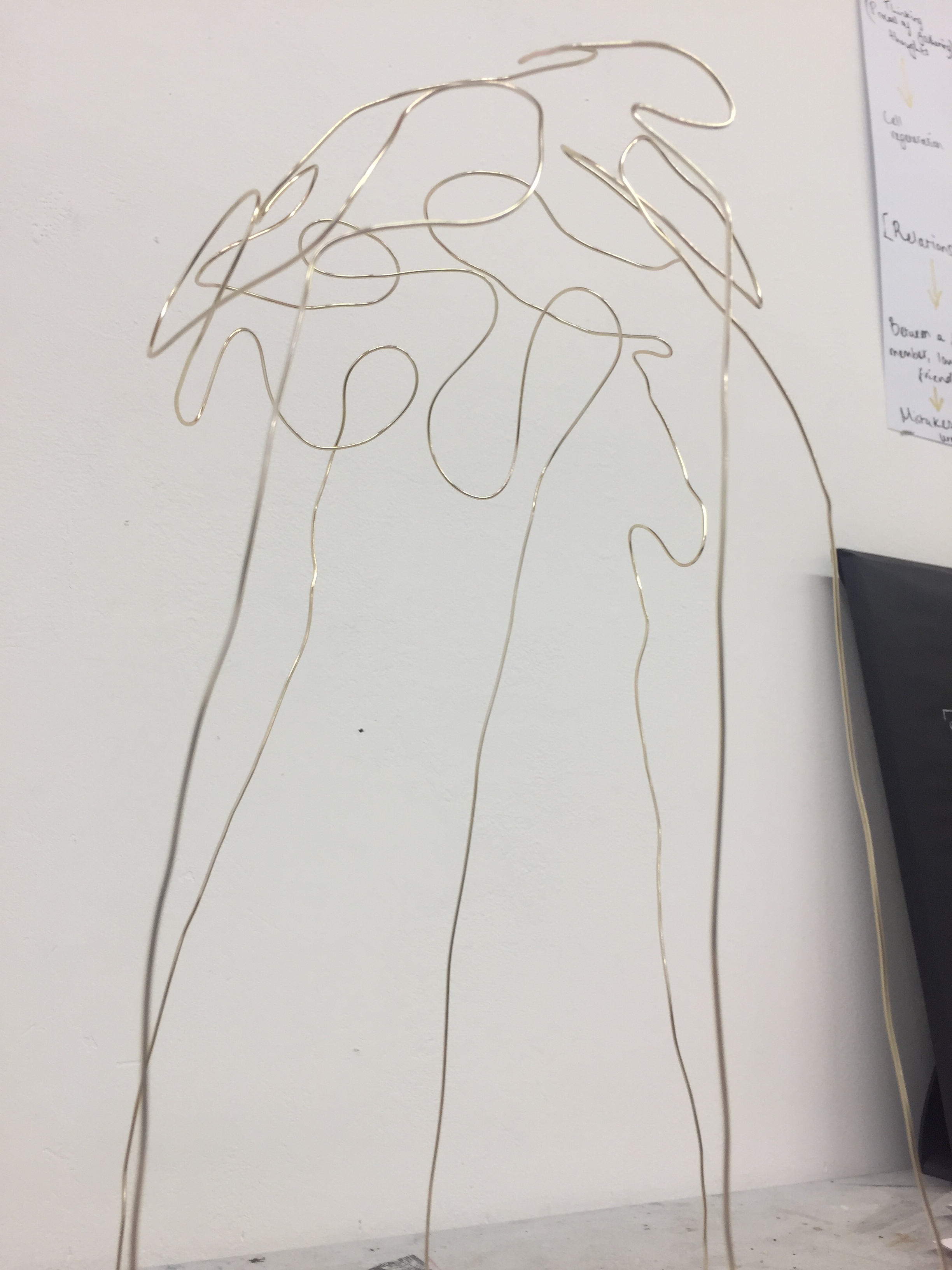 The thinness of the wire gives the structure a really delicate touch, which suits the curly shapes it makes. The thin wire also means that this sculpture would be easily paintable in the way I have done – white thin lines. The shape doesn’t take up too much space so painting underneath it wouldn’t be too covered up.