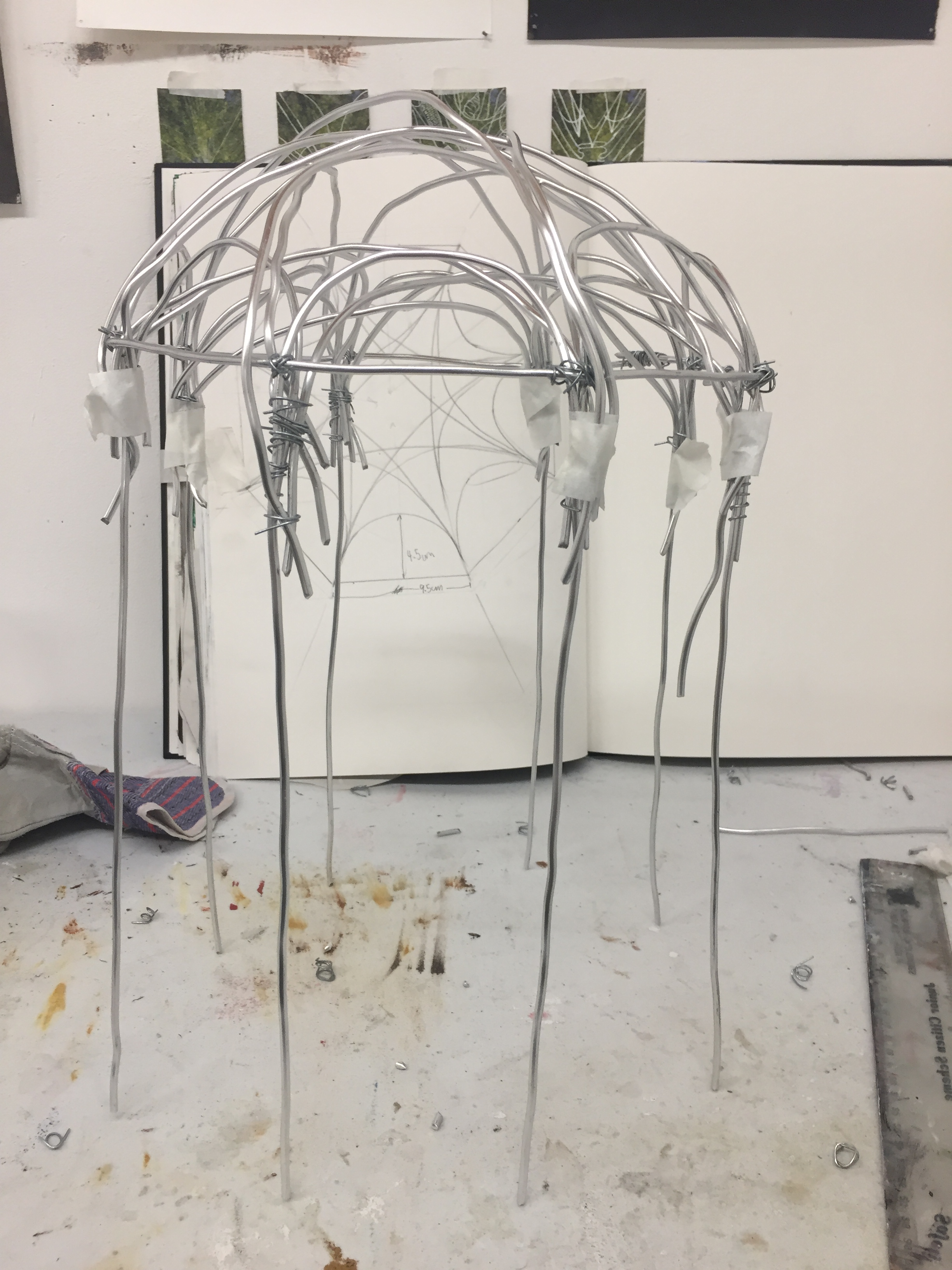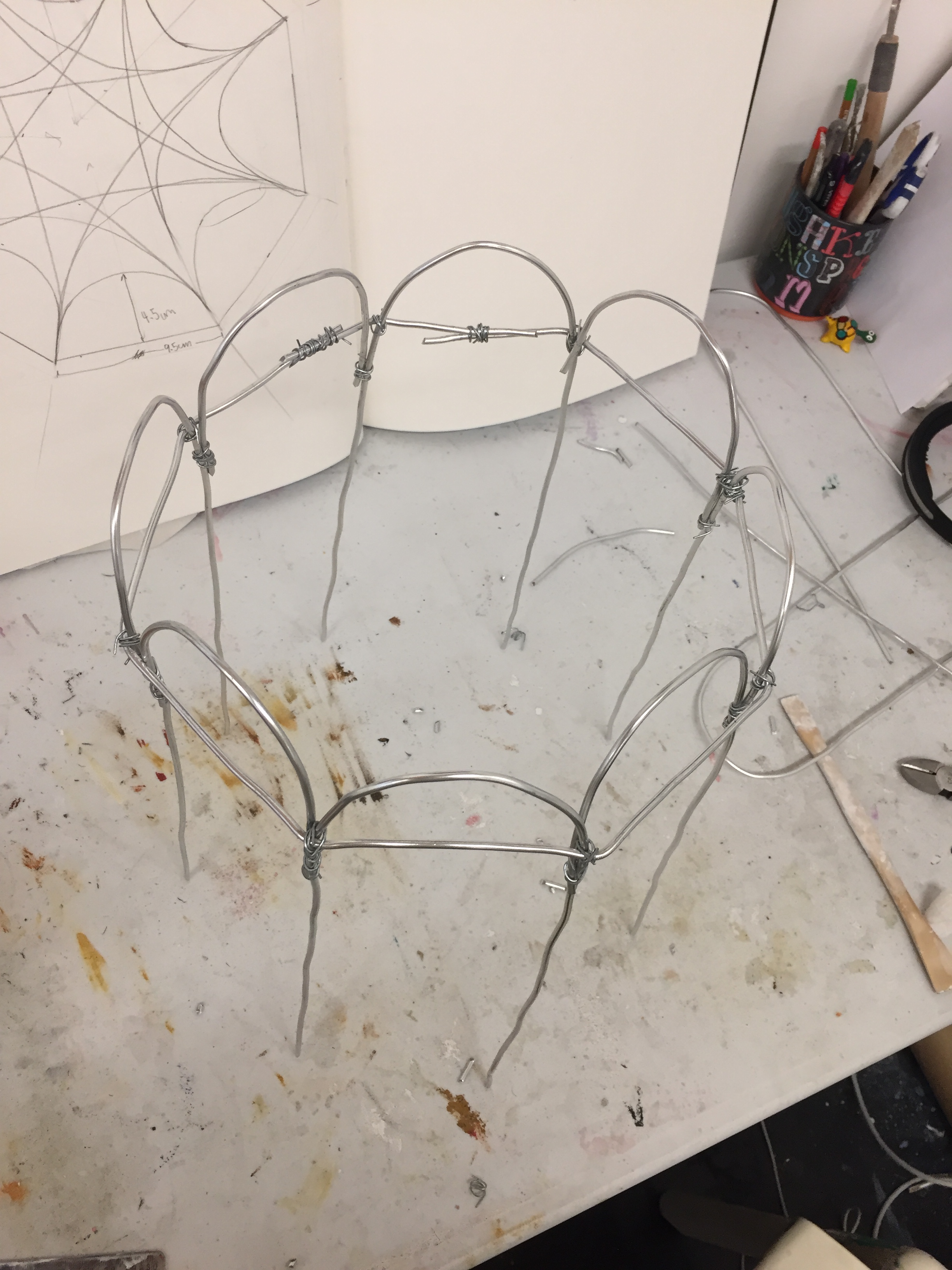 The part I struggled with the most for this stage was attaching lots of layers of wire ends to each corner of the octagon frame. It began easily, using thin wire to tie two ends of wire frame together. But I ended up attatching so many ends to each corner that I ran out of wire, but also each corner got unnecessarily bulky.