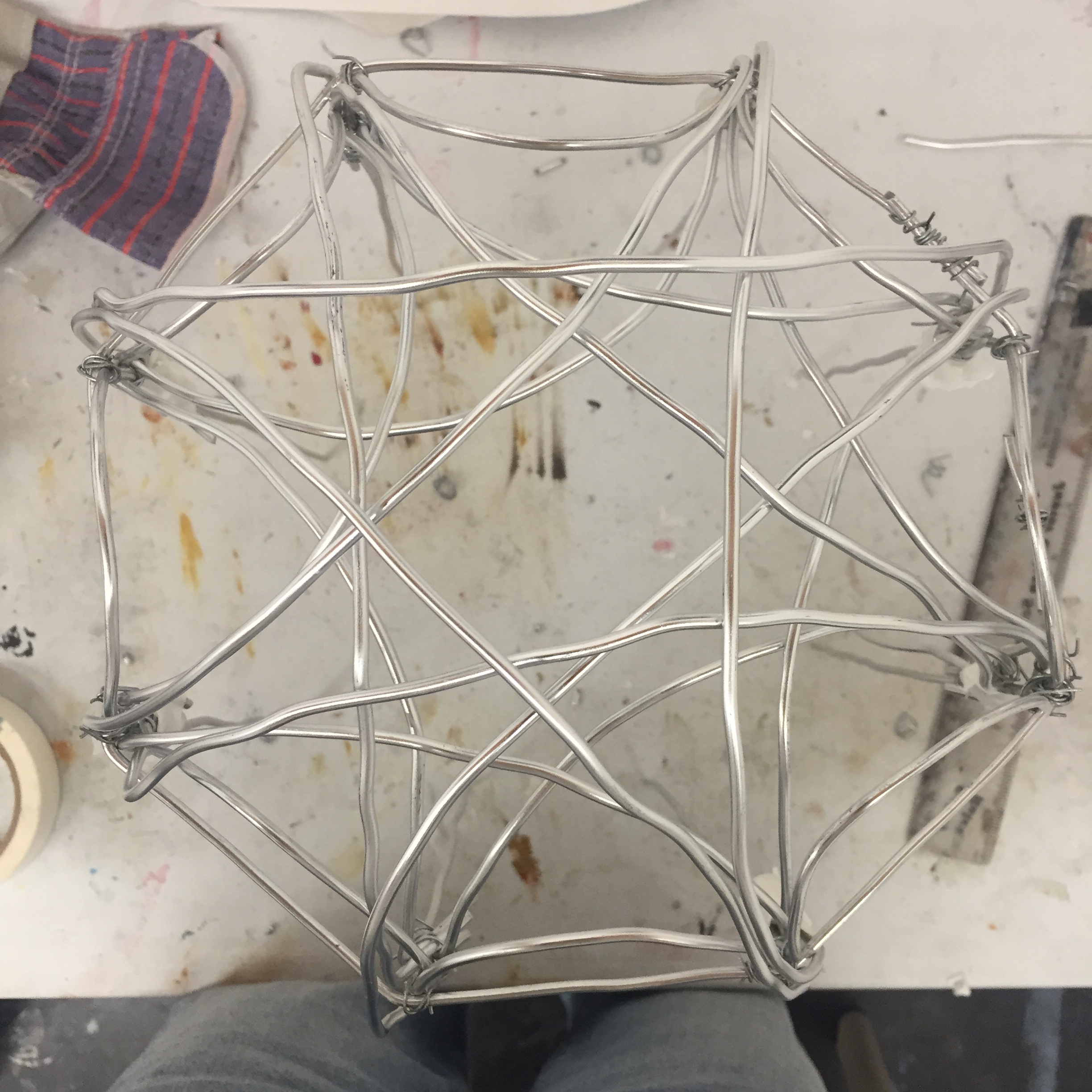 It would have been better in retrospect to have more wire, because more wraps of wire made for stronger attachments, but also, instead of making each curve as I went and adding the curves one at a time, it may have been better to make all the curves before hand, and tie them all together at once, attaching all of them to each corner of the octagon frame at once. When I make more structures in the future of this kind I’ll try this method.