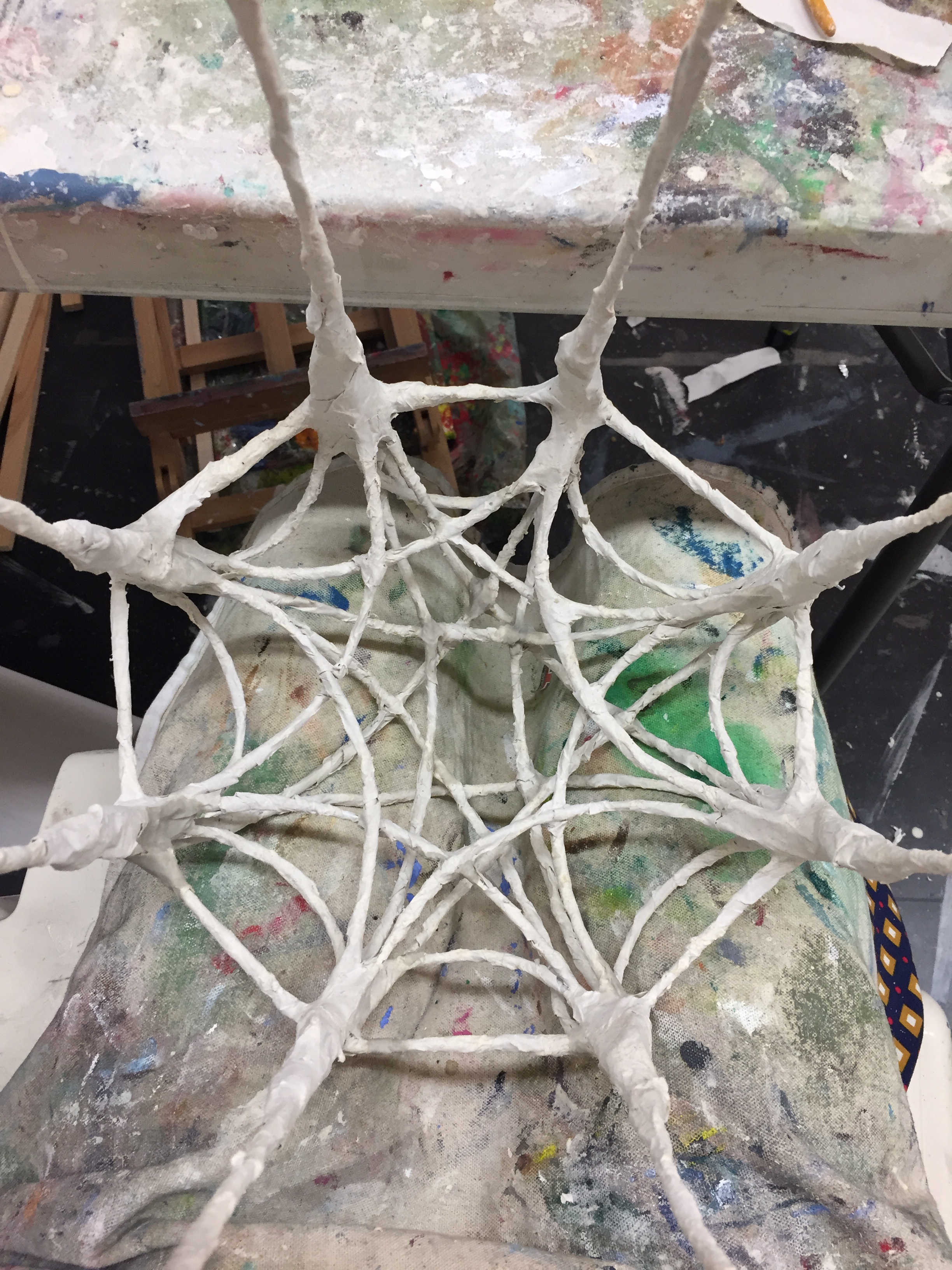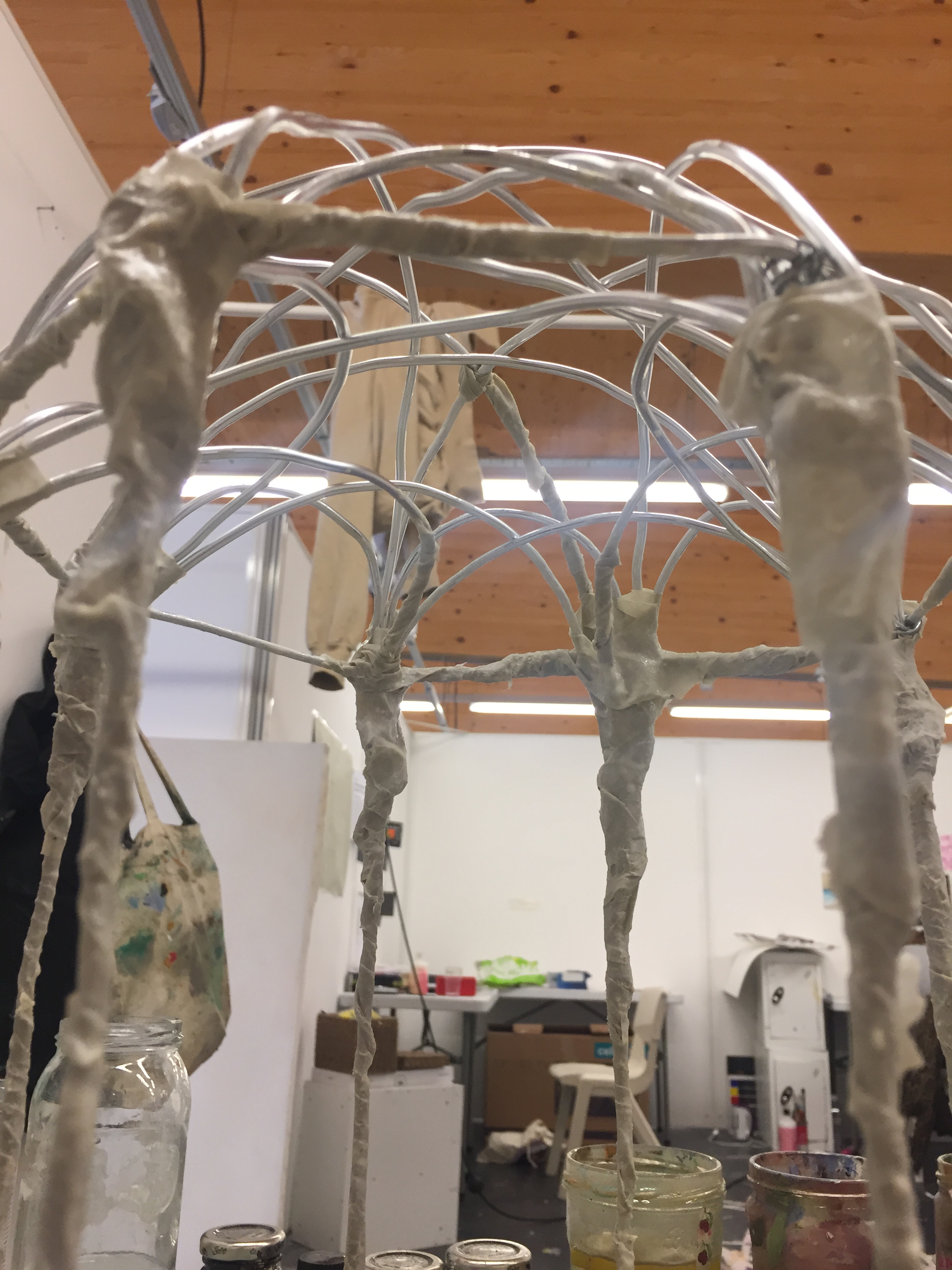 Another reason for adding paper mache that I realise only now having completed the sculpture is that covering up the wire and painting the structure white makes the shape look like nothing recognisable. When the structure was wire, the making of the sculpture was obvious – the maker had bent wire and attached it together to make this pretty shape. But when the wire is covered up and painted, the making process is far less obvious and the focus becomes the mystery and weirdness of the object, instead of the familiar artist’s process that made the object.