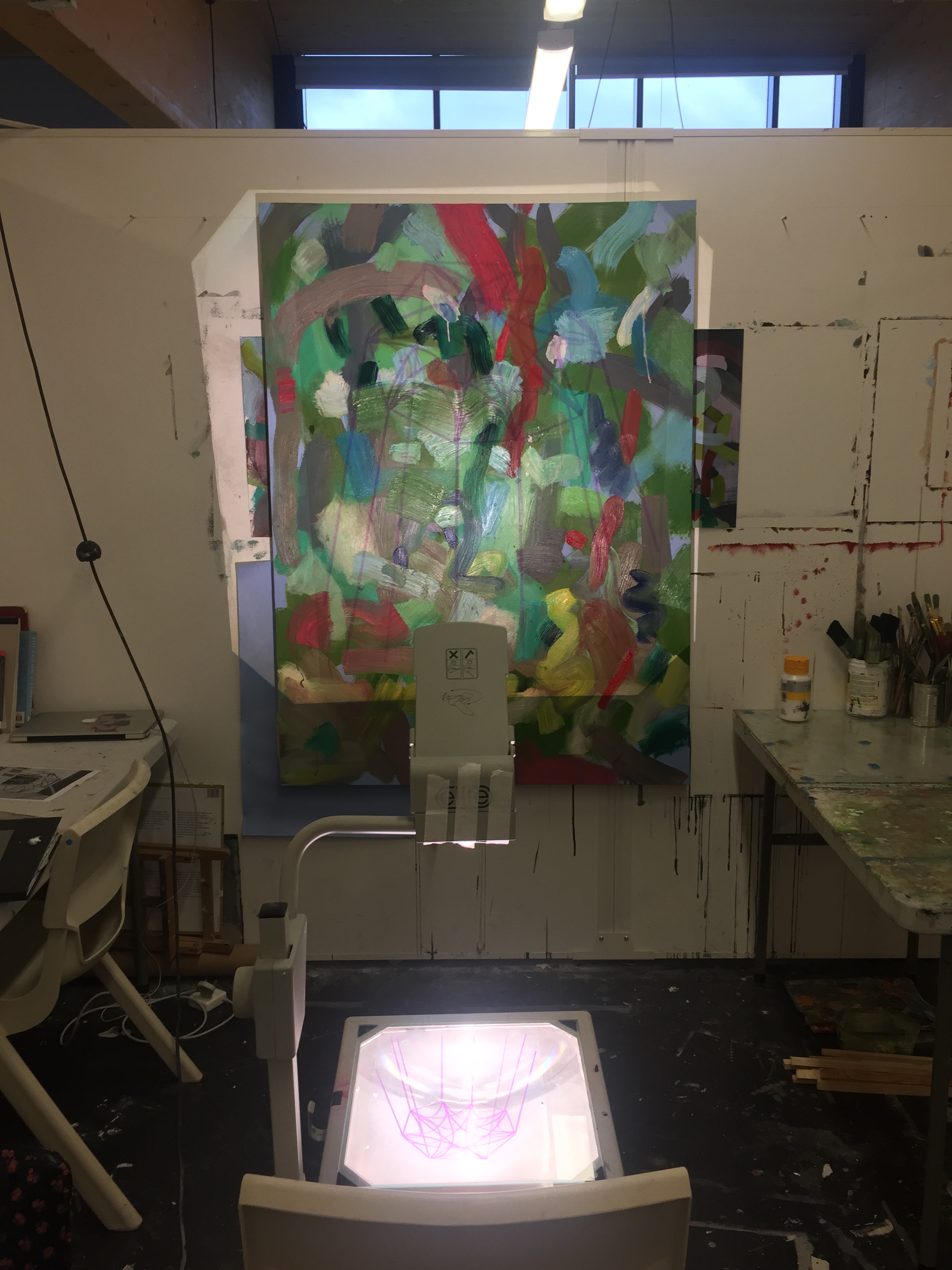 This what the projection looked like on the painting. It was then a matter of painting the white lines on following this projection. For detailed as I went thought and techniques of this painting process see my mini sketchbook.