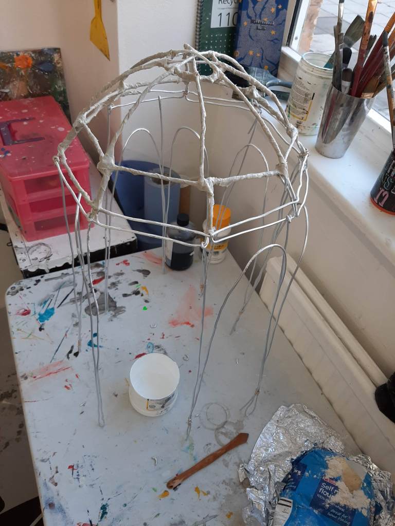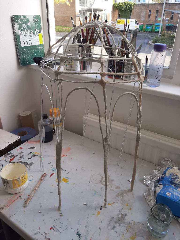 After the first layer of paper mache all over the structure, I added a second row of arches to the bottom of the ‘legs’ of the structure. I was tempted not to bother with this (because the process is very slow and painstaking!)