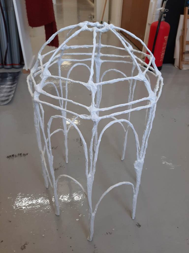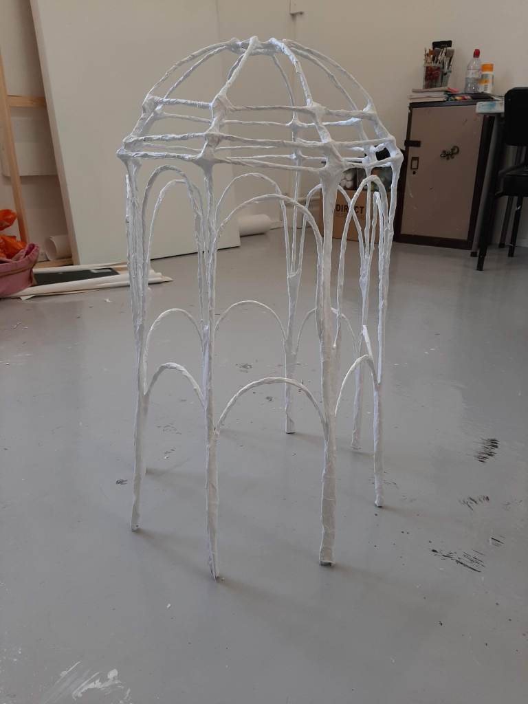 I then painted the whole thing white with acrylic paint! This is to conceal the uneven colour of the paper mache, and make the structure look even more abstract.