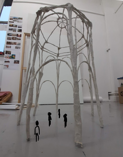 The little people would give the space a relation to something more real. But it might take away from the abstractness of the structure, because the shape then more clearly becomes the framework or ‘bones’/’skeleton’ of a building. (Those ‘words’ fit the sculpture so I’m testing out using them).