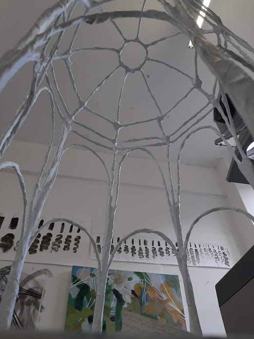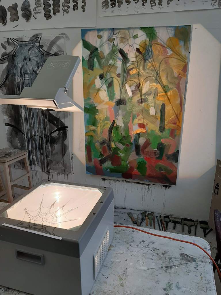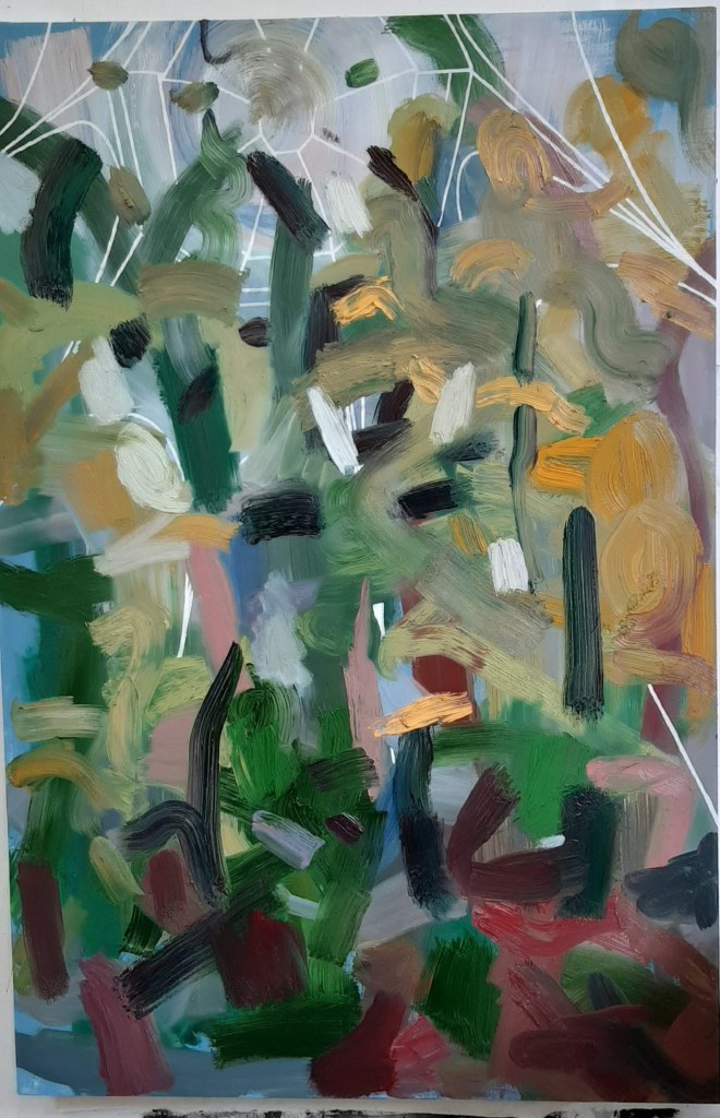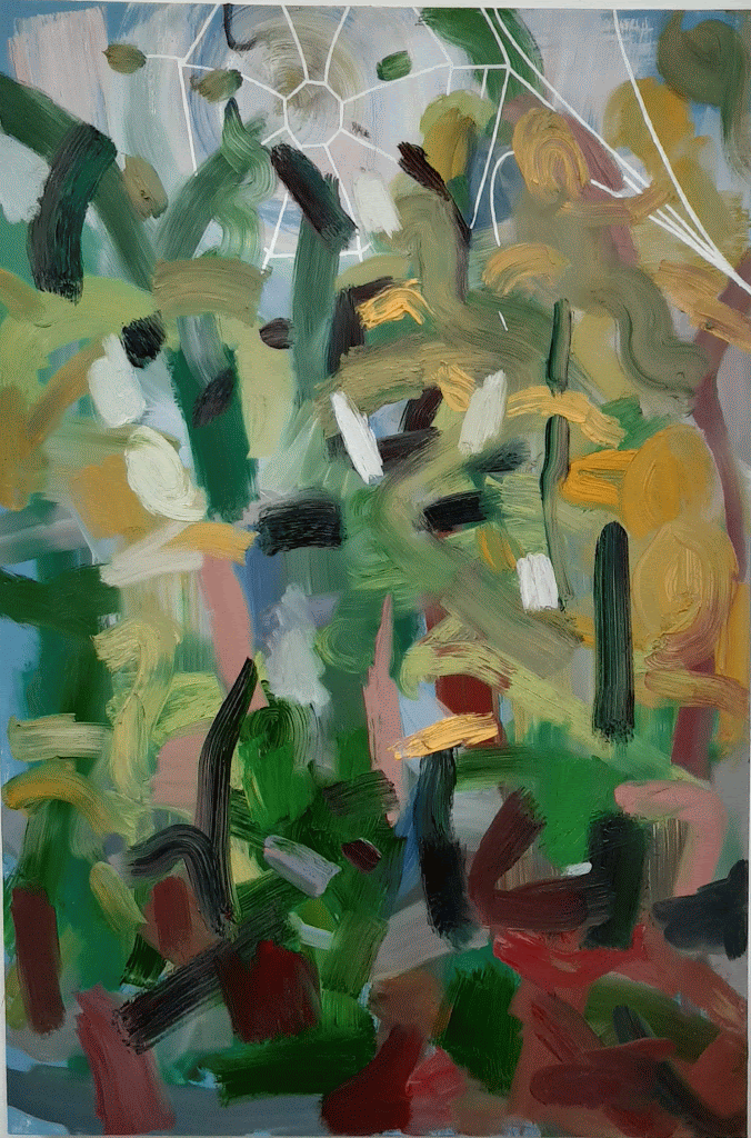 When deciding on the angle, size and position of the structure in the painting I took into account the shapes in the painting. Although the painting is an abstracted woodland, I think the painting has a ground, a (hidden) horizon, tree canopy and sky – It’s like I’m painting (constructing on the canvas with paint) a forest of my lived perception – I’ve started saying that recently: