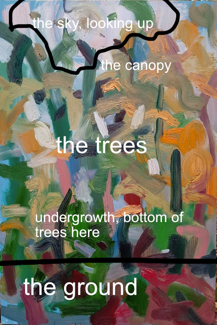 There is a lot of ‘ground’ in the painting which means the ceiling of the structure is cropped out a little more than I think would be best. This is something I’ll have to try out to confirm. But I do think it would work for the painting to have less ground in it, and be more focused on looking up, at the canopy and the sky.