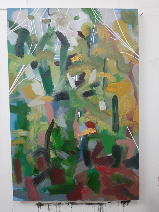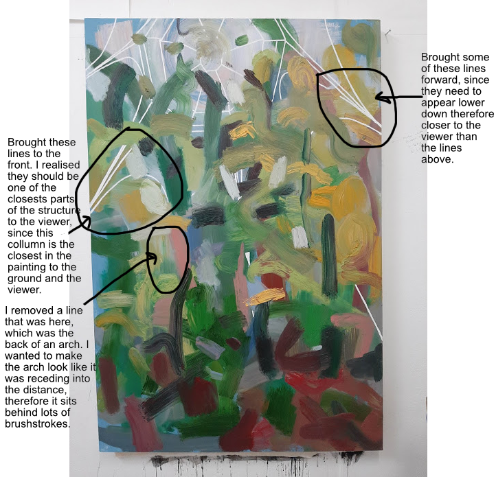 My intentions are to reconsider which lines need to sit ‘in front’ of the brushstrokes and which need to sit ‘behind’. I want to push the back of the structure further back, and bring the front of the structure further forward, to make the structure and therefore the whole painting appear as a three dimensional space.