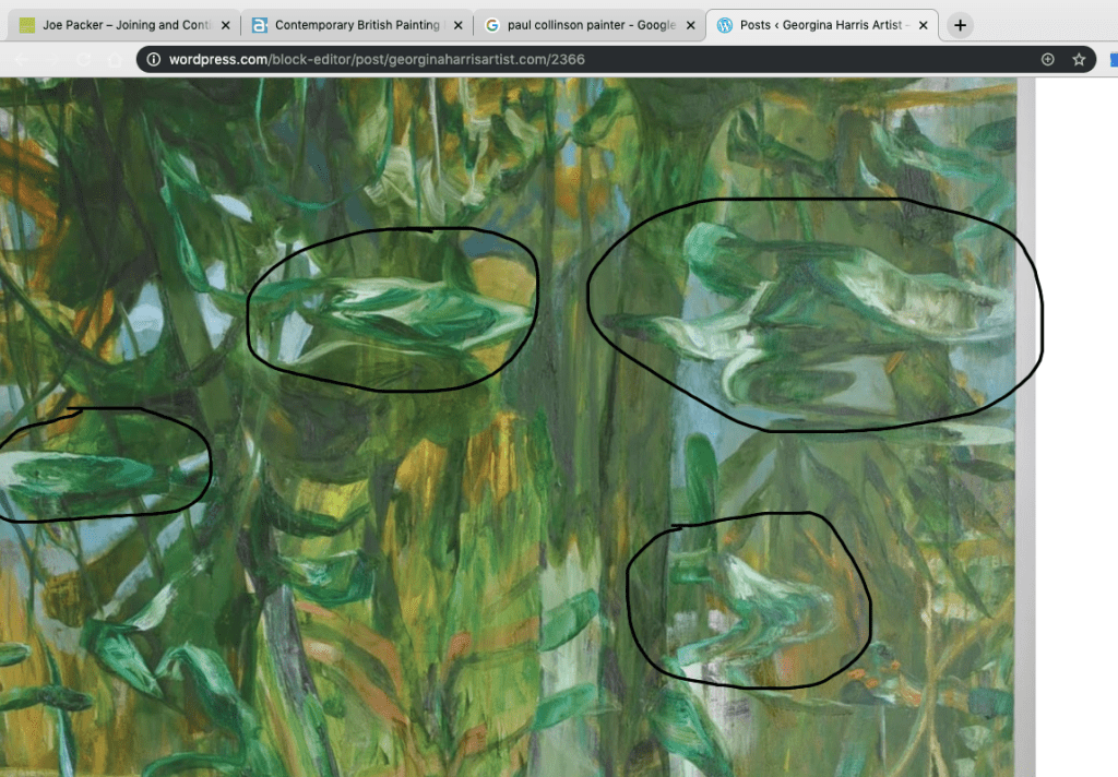 ^ This is interesting because it demonstrates to me how different my process is from Packer’s. My process is one of preparation and design, planning and doing. For example, I will test background colours and pick one to use, and I will pick my colour palette necessary for the day I am painting outside – so I will design my colour palette based on observation and preparation.