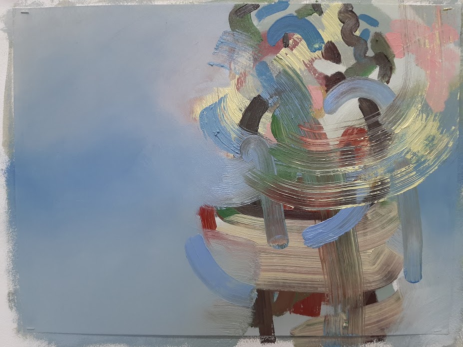 If I had more time, I would have waited for these marks to dry and added more blue background to cover the bottom bit of the mass of brush marks, to mesh the background with the mass a little better. But perhaps the fact that I don’t have time to do that is a good thing! It means I can’t overwork the piece.