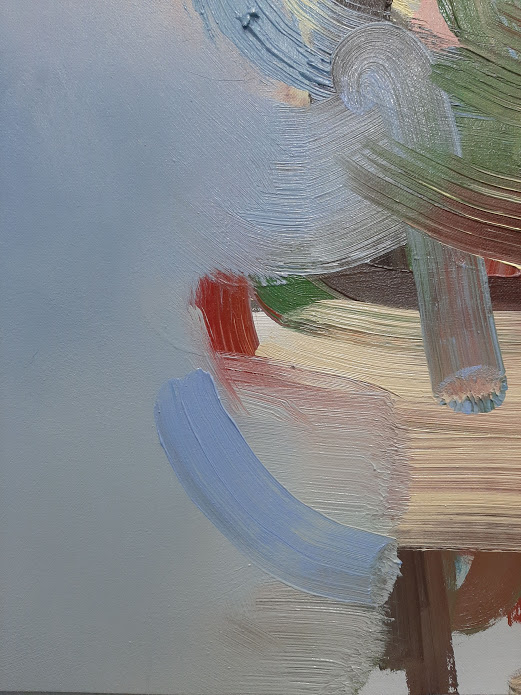 I wanted to cover some of the bottom part of the painting with the background colour. So I used two big brushes to do this, one to apply the paint quite thickly and one to blend with no paint on the brush. I ended up blending the paint so that the gestural brushmarks blend seamlessly with the totally blurred blue. This is interesting! The viewer doesn’t know what is appearing from where. A close up: