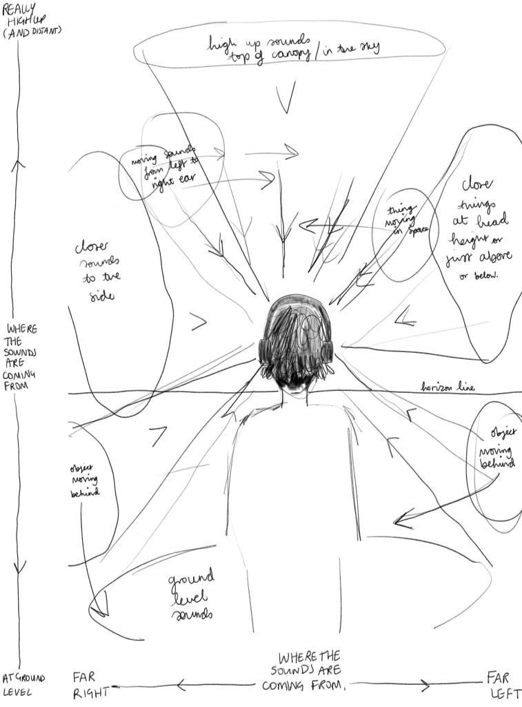 I have become interested in the idea of nature soundscapes, and how they can draw attention to a great empty space above me, framed with tall trees or perhaps just open sky with birds above.