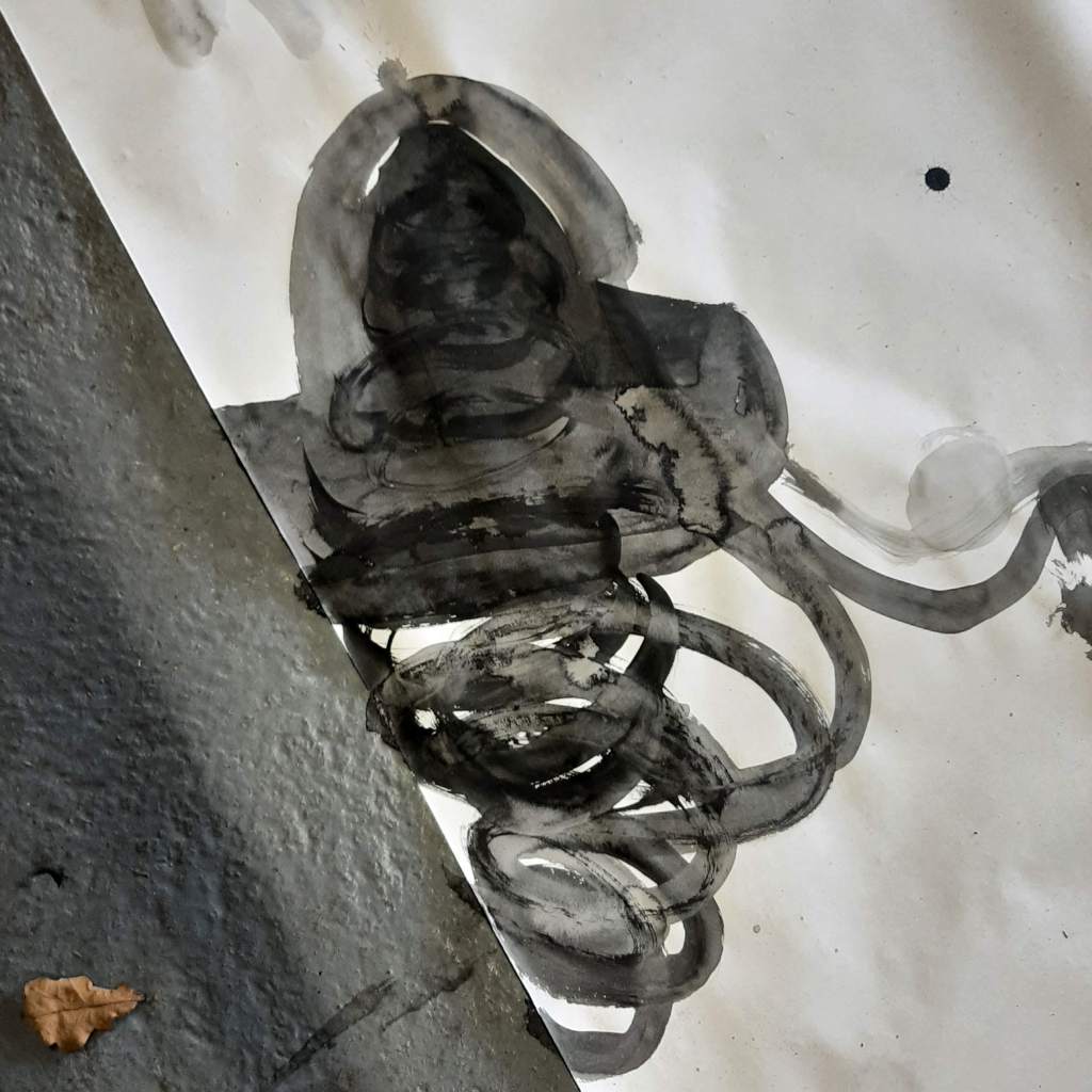 So, my process for recording this world which I am striving to get down: I am starting out with ink, a brush and large pieces of blank paper. I am making blob shapes in varying concentrations of watered down ink. From pale grey to pure ink black.