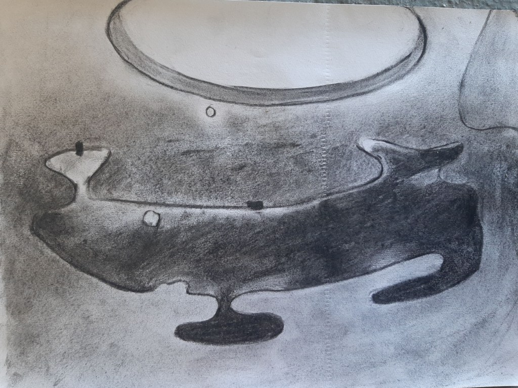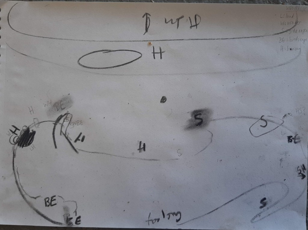 Charcoal sketches, spatially arranging the island, finding ways to articulate the geography within the frame of a cuboid piece of paper: