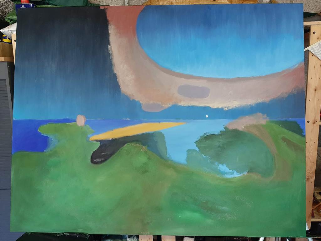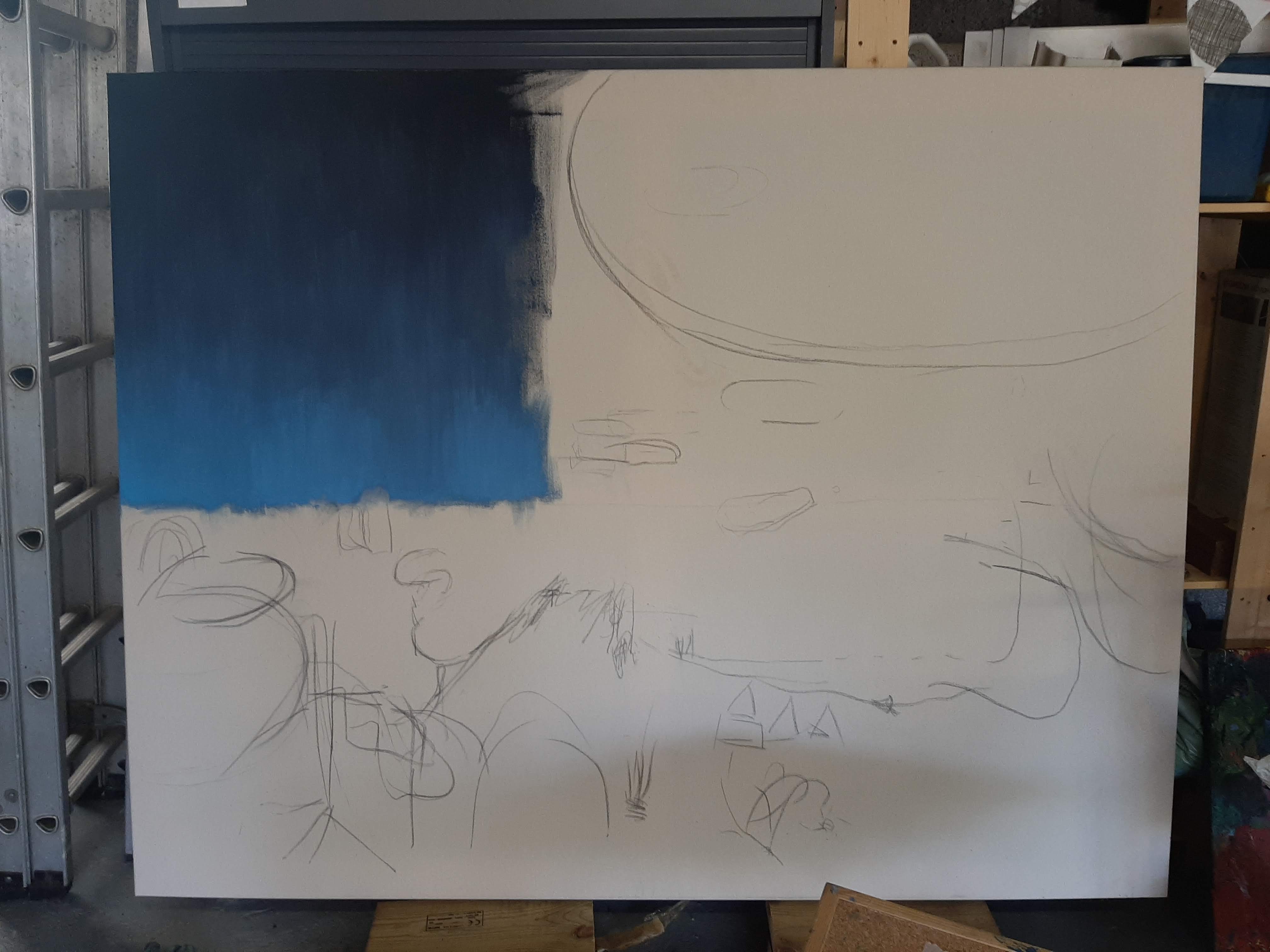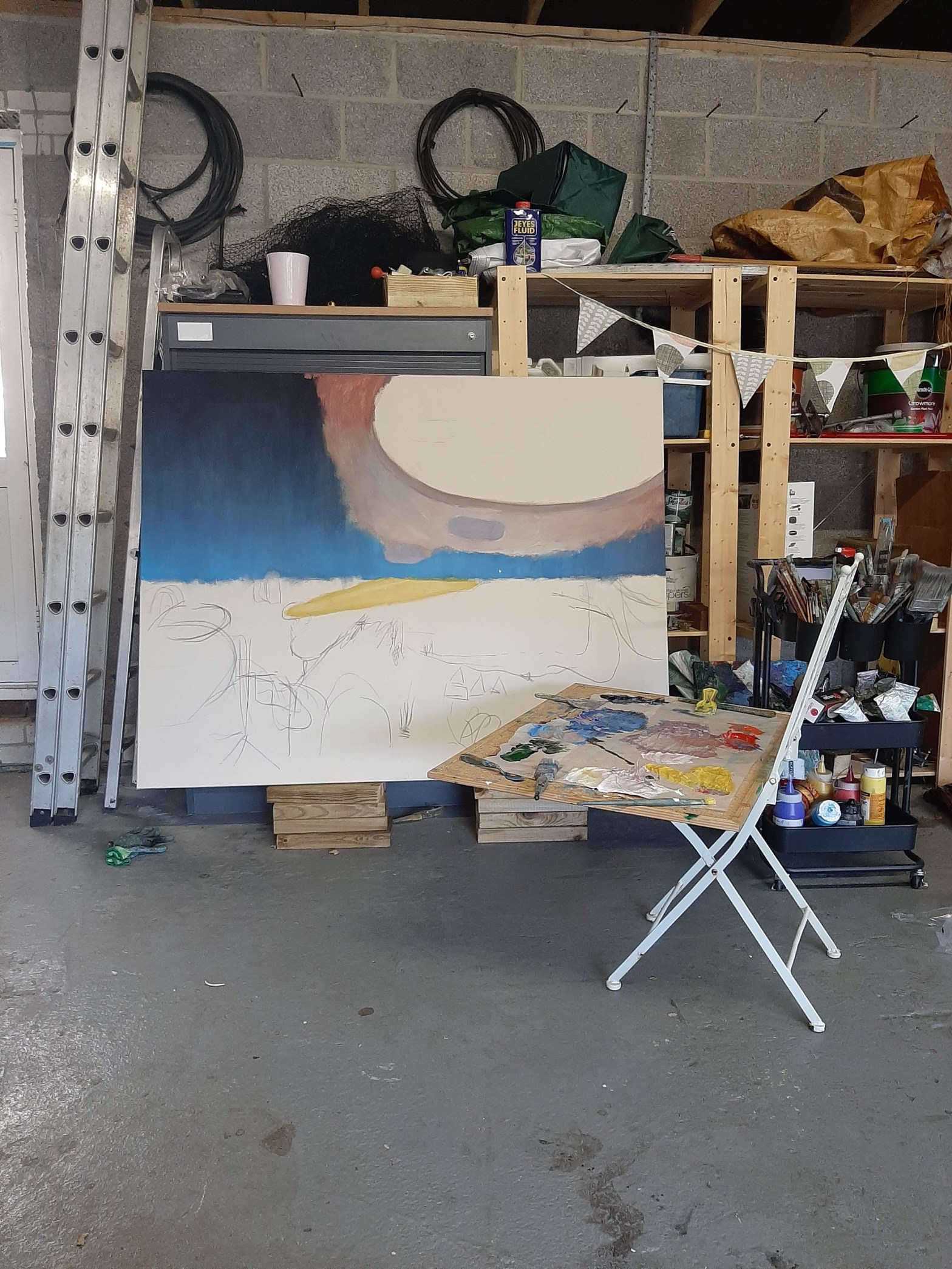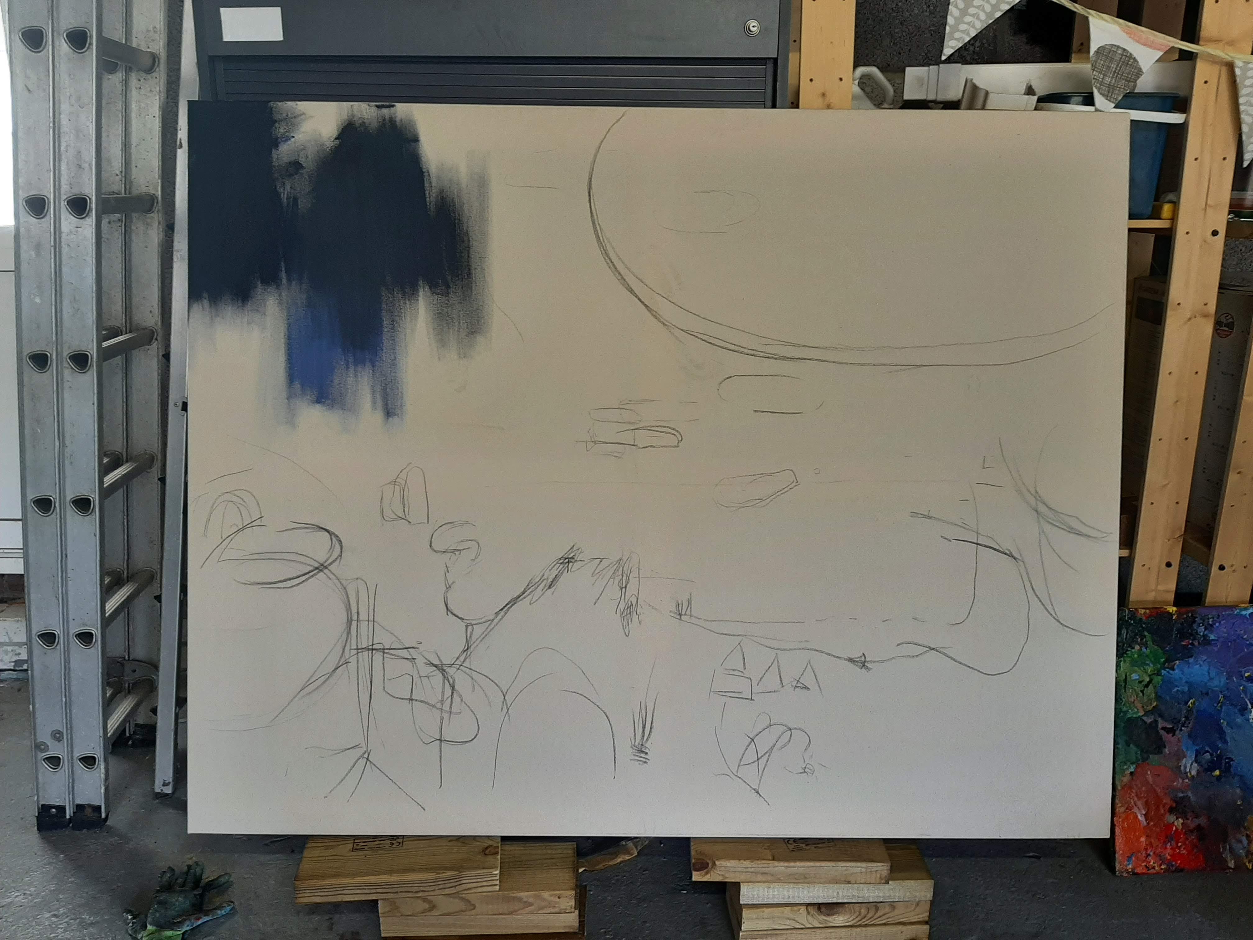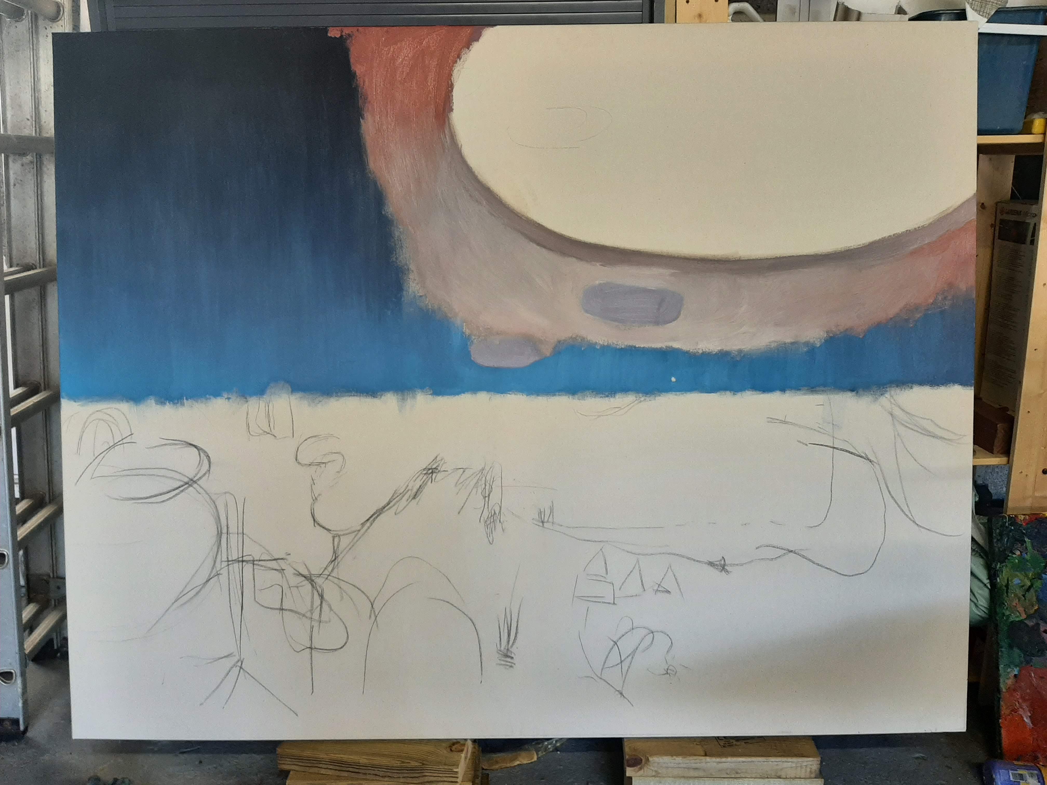 Starting this 125 x 160 cm stretched canvas. It’s going to be a painting of St. Agnes, the island I lived on this summer. Painting in this way, using memory and sketches and plein air studies is quite a new method in my practice. This painting feels like a warm up, an experiment.
