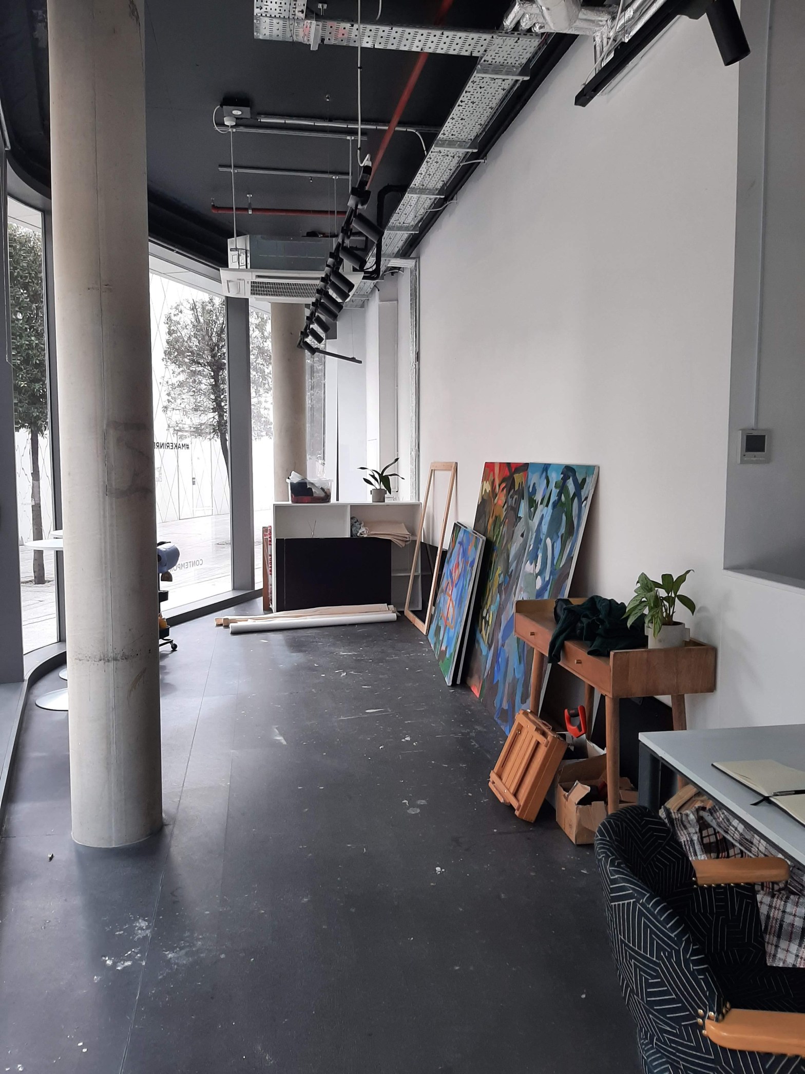 The space is long, with one entire half of the studio being huge glass windows out to the courtyard beyond. The river is a minute from me, and there’s a cute cafe round the corner. When I shut the door to outside I can hear no traffic!!! A godsend.