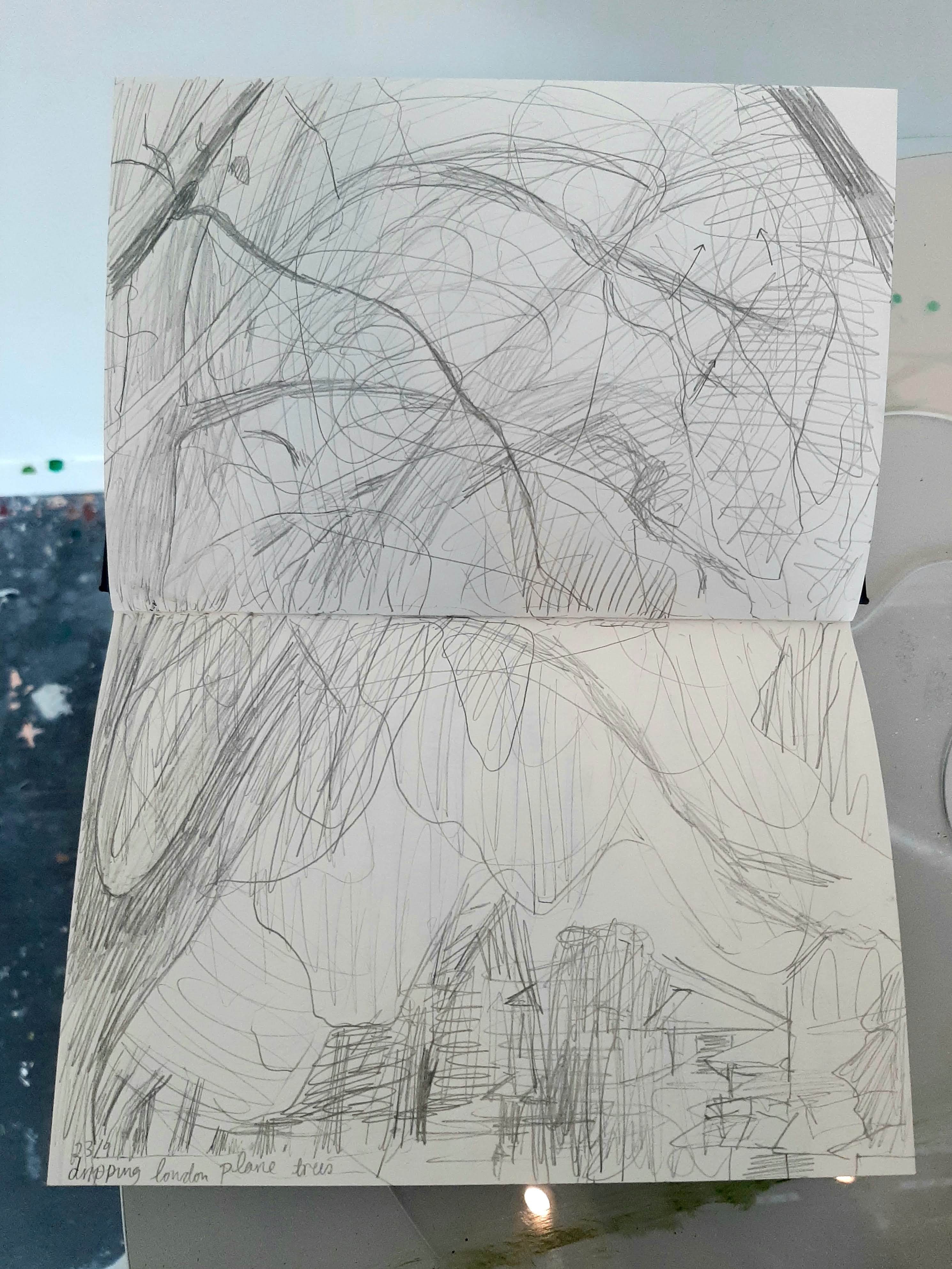 London planes have this wonderfully drippy canopy. As expressed in this plein air drawing I did a few days ago: