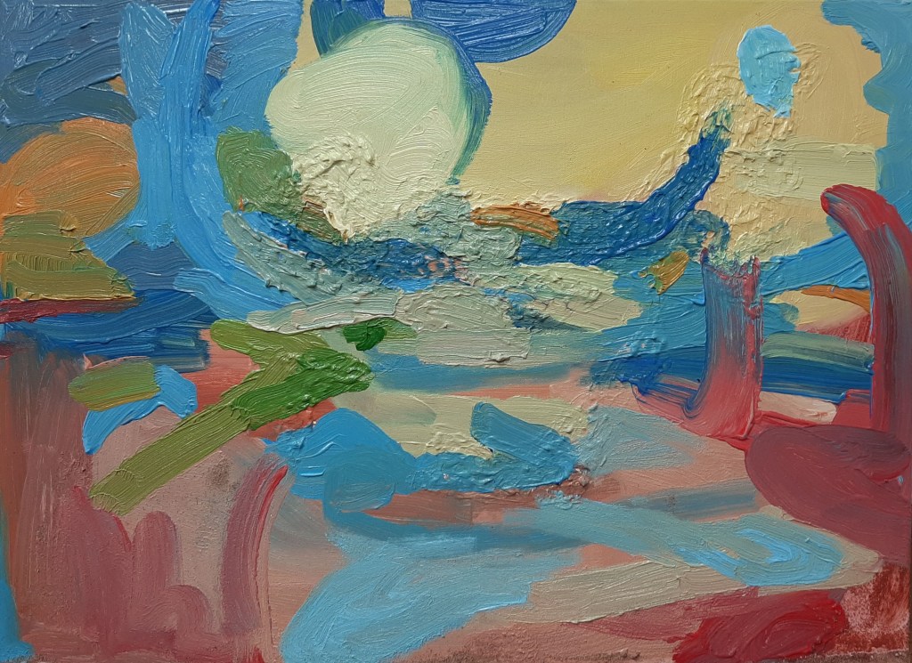 This doesn’t mean these curvy shapes are simply bad. I noted this summer that when I am shaping the edge of a curvy orb entity (what word should I use?!), I am defining the edge of a sensation. Perhaps I am giving my sensation-marks such decided boundaries as a method to manage such broad, vast, seemingly whole landscapes. This method might reflect my human predisposition to break up and categorise my total surroundings. And that’s exciting, that I could capture the same mood of a place by breaking things up? It is a reflection of my human perception of the world. But my paintings that were made more on impulse, unrefined marks, were they a reflection of a different layer of consciousness? A different layer of emergence of the ‘out-side’?