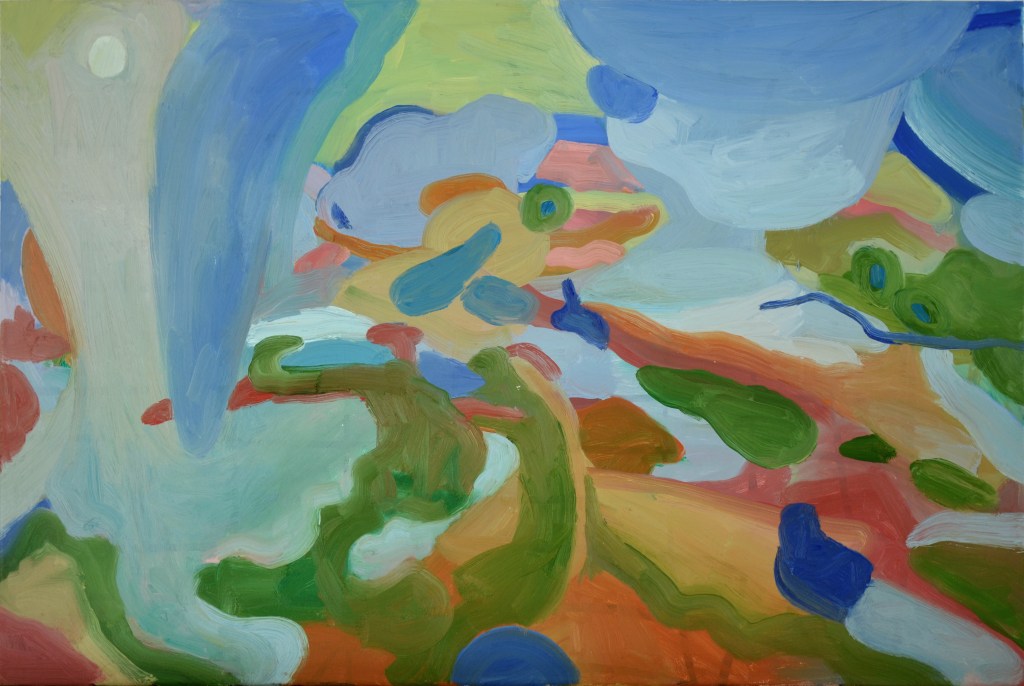 This blob, curvy, flowing style all started when I picked up oil paints again, when for the first time since being graduated, and of course since the pandemic, I took them outside to paint. This was the painting I did then:
