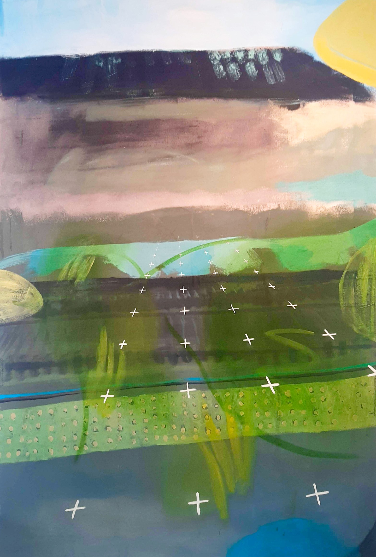 So, it’s totally from memory. Of my impression of the railway track I stand on every morning to go to the studio. And then, glazed on top, are these vibrant green abstract forms. The idea for the painting came to me when I was standing on a platform whilst listening to the sounds of a forest. It’s been driving me a little mad not going out into the non-human world every morning, and I have been listening to nature soundscapes as a way to calm those feelings.