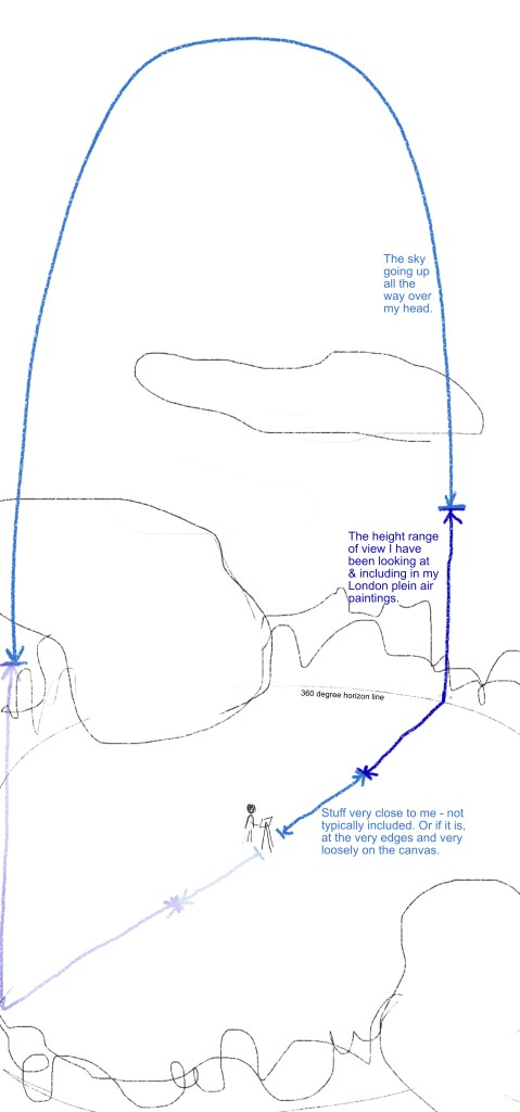 The next thing I want to do is go and walk back along the river in the dark on the way back to the station this evening to notice the sky. Similarly, I feel I need to go and look and study the sky in the day, and at dusk too, when the blue sky is out. By doing some plein air painting, that feels appropriate. Yes! Because when I’ve been looking at this part of London, I’ve been focusing my attention on the stuff around the horizon. Except there is the whole of the sky above to paint too! Here’s a lil sketch of what I mean: