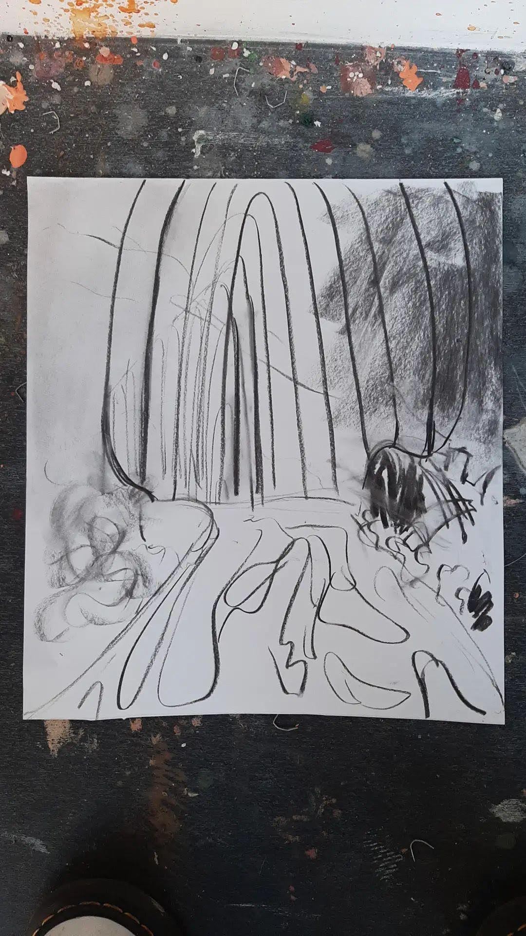Here’s a first charcoal sketch composition plan. The dark patch on the left is the night sky. And on the right, sunny, sunset-esque weather cuts across into the night on the left. It’s basically a multi-time-of-day painting!? I’m unsure how that will go. But actually, saying that, the Agnes painting is multi-time-of-day too! When I do this kind of painting it’s like I’m taking all the parts of my memory of that place, cyphering through the crucial ones, and then putting them on the painting. And of course the crucial moments aren’t always going to be from one time of day. These paintings (Agnes and this current one) as an amalgamation of multiple memories, created into one aesthetic painting.