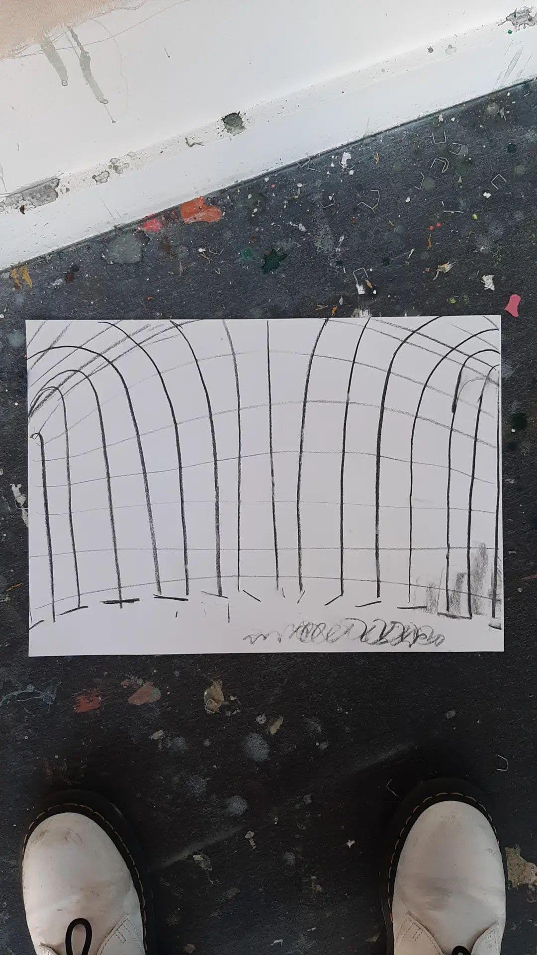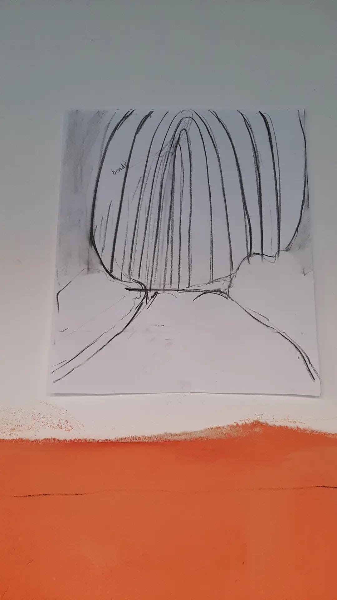 Since then I have done a few more drawings, all on this theme of a structure that defines the empty space and my experience of it. It’s like a tunnel following the route of the river through the city. I have this tendency to use structures, architectural looking ones, to define the experience of a place in a painting. More specifically, to define the experience of space looking up, in a painting. Just like I was doing back at uni. This tunnel shape does not describe what the place looks like, it describes my experience of the place, I am finding visual motifs to describe more-than-visual, bodily experiences. I am attempting to build an experience that I have had in the past, using designed, created, abstracted motifs to do so. And this experience is intended to be experienced, glimpsed at by a viewer of my painting. And in some way their perspective shifts, or their own feelings, experiences feel understood, communicated, shared. Very profound, dramatic intentions!