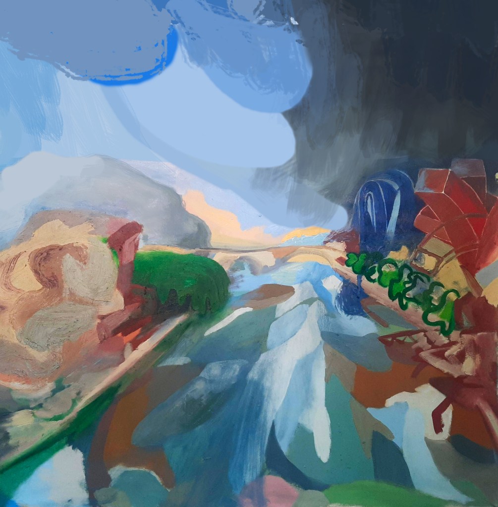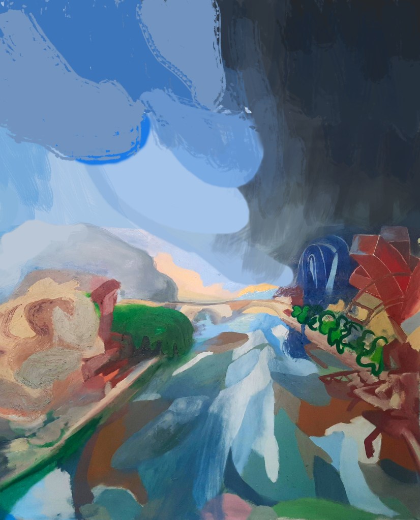 It shall be interesting to see how visiting the place goes. Perhaps nothing about this view of the river has bodily significance for me. Every place has bodily affects, since our environment is constantly affecting the confederation we call ourselves, ‘me’. But I am not painting just any bodily affect, I am painting bodily experiences that strike me, which I am spurred to paint, recreate on the canvas, excited by. For reasons I do not know! (Seemingly on the theme of big spaces and heights, who knows!) Perhaps this spot I am painting doesn’t contain whatever cocktail of elements makes me have a significant bodily experience I want to paint. Although perhaps this attitude is due to me never being open to bodily experience emerging with place-attention. This should be an interesting experiment.