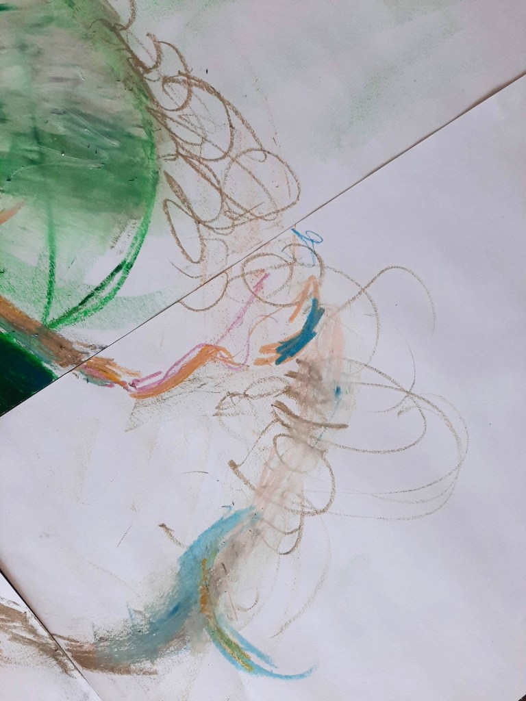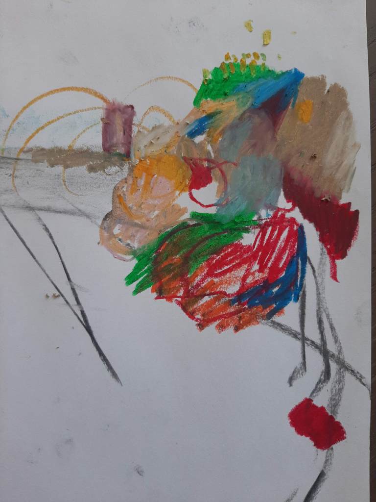 Some interesting effects are produced when you put oil pastels over charcoal; the friction of the chalk pastel moving over charcoal pushes the charcoal off the paper, giving the pastel marks outlines of white. In this photo you can see it in the top left marks: