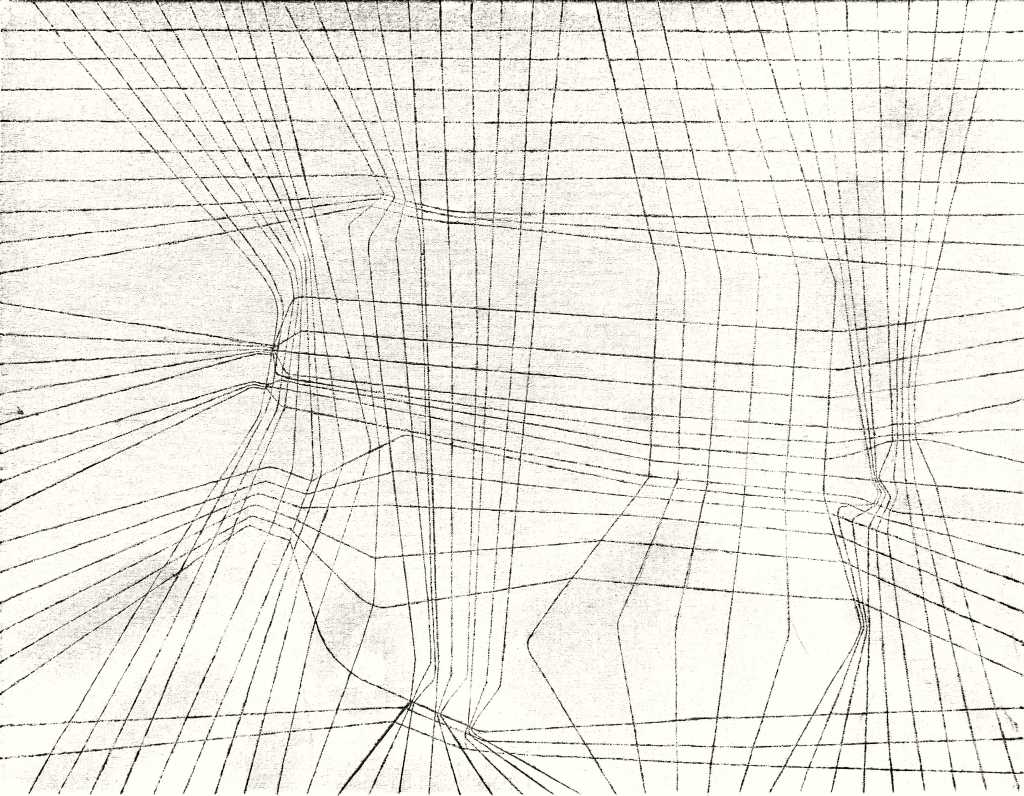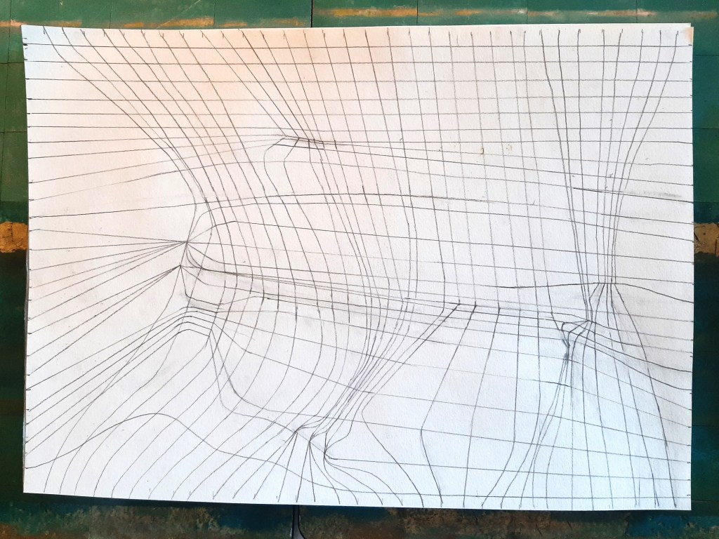 In between lines. I made a decision to not put any ‘in between’ lines in – ones that curved in between straighter lines guided by connection to a perspective line. The result is that the grid doesn’t have a uniform flow. I want to the grid to look like one undulating surface. To do this I would have to include ‘inbetween’ lines. Here’s a digital edit I did where I added these in between lines, showing the difference they would make: