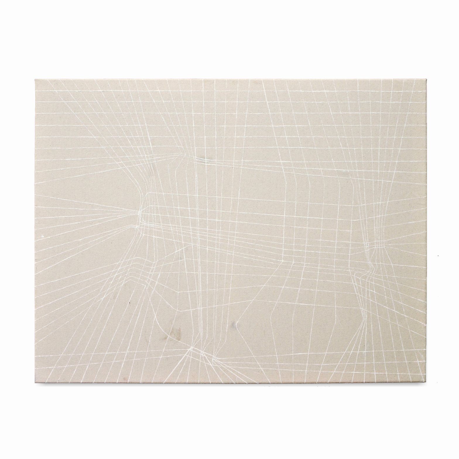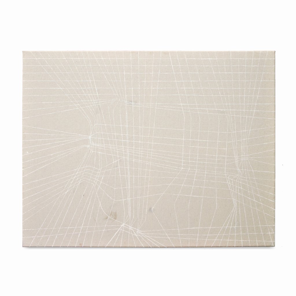 Raw canvas. The cool thing about painting on the raw canvas is that the paint lines are interrupted by the texture of the canvas, and so the lines have a kind of shimmering quality to them. They are not completely filled in.
