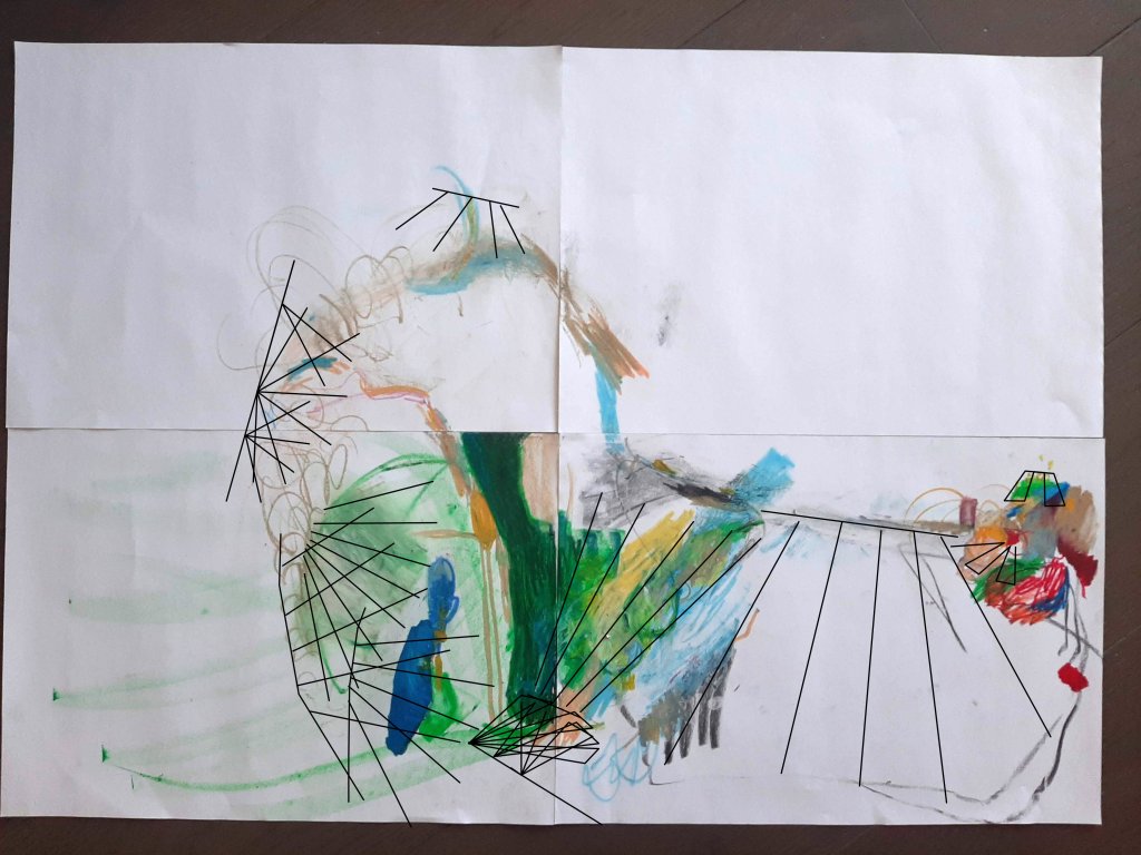 Looking at this finished drawing, I could see that there were multiple perspectives across the map-drawing: in some places the drawing was birds eye view, and in others I had drawn in a horizon line, drawing from the perspective from down on the ground, from my own perspective of the memory. I wanted to ‘map‘ these shifts in perspectives across the drawing. I started on photoshop: