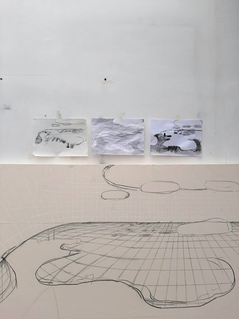 The blue dome shape is based on an amazing cloud line that I saw at the beach on day in Morecambe Bay. I soon after made this curved shape on the canvas, and I guess my intention would have been to add the clouds underneath. Coming back to the painting last month he curved shape has become the edge between the water and the land of Morecambe bay, and I am mapping out my memory of the land around the water, using colour, shapes and texture to instinctually describe what I can remember. I’ve been interested in old maps and their compositions, and this painting has become an experiment to play with these ideas. I kind of want to add a border to the map with some figures or other shapes or a pattern perhaps? Stars or waves or trees or something! Kind of decorative, spiritual map-esque. Yes.