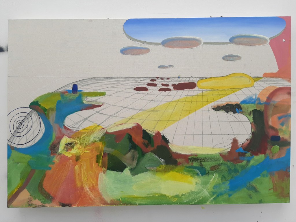 Another painting I’m working on I began over a year ago, when I was working at a studio in Morecambe. I painted the blue dome shape and then moved away and haven’t taken it out to work on until I moved to Manchester this summer.