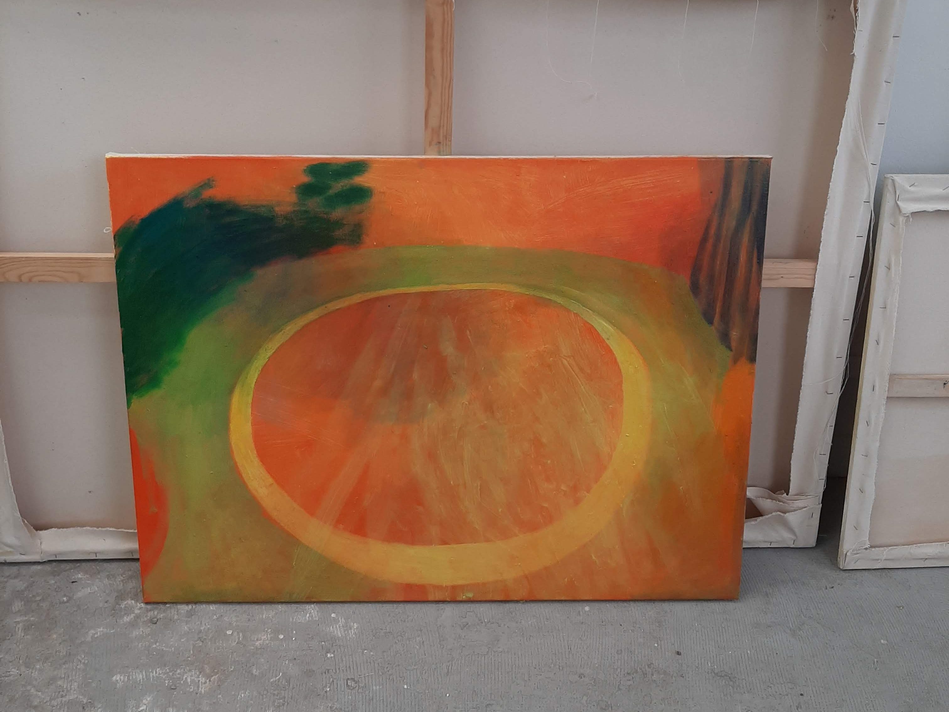 I have strong memories of exploring this big expansive field every summer. The yellow ring in the centre of the painting is a running track – this long length of rope we would unroll every summer and race around in a family sports day type event. Running the shape of the track, the soft curve of the land upwards as you run down the garden. The colours of the dappled sunlight under shade trees, the lush green of Devon’s countryside and the red earth. The light breeze and the possibility of the outdoor space. The feelings of these things is what I am trying to distil into the painting.
