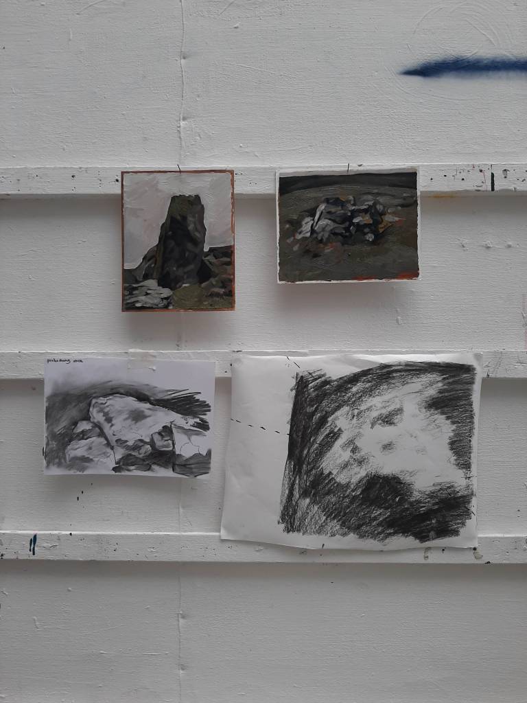I drew the rocks just showing through the grass, in charcoal on paper, and then got cold and felt the urge to go back to the studio and paint them. I came back and painted two little 6×10 inch paintings on paper.